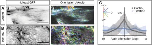 Figure 4. Twinfilin is required for actin node and cable formation. (A,B) TIRF images of actin cables in control and Twf1 morphant DMZ cells. In right-hand panels, color reflects orientation of cables as indicated by the legend in C. (C) Quantification of actin cable organization in control and Twf1 morphants. n=6 control embryos, n=11 Twf1 morphant embryos. P<0.0001 for control vs Twf1 morphant (Kolmogorov–Smirnov test). Scale bars: 10 μm. |
