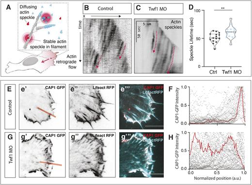 Figure 6. Twinfilin regulates actin turnover in protrusions during CE. (A) Schematic of fluorescent speckle imaging. (B,C) Kymograph from TIRF movies showing fluorescent actin speckles in lamellipodia in control and Twf1 morphant Xenopus DMZs. Scale (x, distance): 5 μm, scale (y, time): 50 s. (D) Quantification of actin speckle lifetimes. n=15 control protrusions from three embryos; n=15 Twf1 morphant protrusions from six embryos. **P<0.01 for control vs Twf1 morphant (Mann–Whitney U-test). Graph is violin plots with the median being highlighted by a dashed line and quartiles with dotted lines. (E) Cap localization in control protrusion; LifeAct in the alternate channel reports actin localization. Red line indicates line-plot measurement taken along protrusion length. (F) Quantification of distally restricted Cap localization in control protrusion. Red line highlighting one example trace, black dots representative of several line plots. (G) Cap localization in Twf1 morphant protrusion. (H) Quantification showing expansion of distal bias of Cap localization in Twf1 morphant cells. Scale bars: 10 μm, unless otherwise noted. (G,H) Cap1 distribution in Control vs Twf1 morphant was significantly different. n=36 protrusions from eight control embryos; n=28 cells from nine Twf1 morphant embryos. ****P<0.0001 (Kolmogorov–Smirnov test). a.u., arbitrary units. |