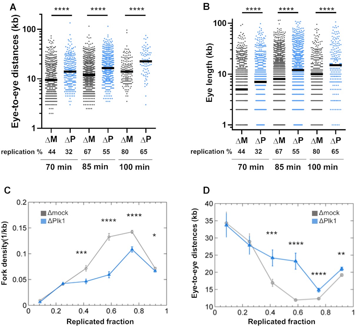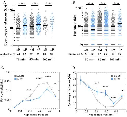 Figure 2.Plk1 depletion increases eye-to-eye distances, independently of replicated fraction of DNA fibers. Sperm nuclei (2000 nuclei/μl) were incubated for different times in mock- (ÎM, dark grey) or Plk1-depleted (ÎP, blue) Xenopus egg extracts in the presence of Biotin-dUTP. (A) Eye-to-eye distance distribution (n = 77â1151) and (B) eye length distribution (n = 196â2507) (kb) (scatter dot plots with median) of one combing experiment representative of middle and late S phase. All DNA fibers were then grouped together in different bins according to their replicated fraction. Means (n = 51â1189) with SEM of (C) fork density (kbâ1) and (D) eye-to-eye distances (kb), calculated for the different bins of replicated fractions of all fibers. * indicates significant difference (MannâWhitney U test, two-sided, P< 0.05: P-values: * 0.01â0.05; ** 0.001â0.01; *** 0.0001â0.001; ****<0.0001). |