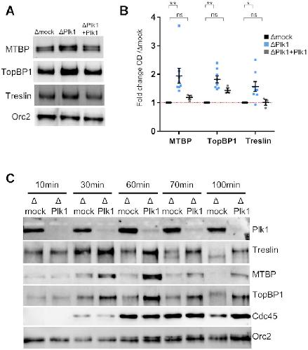 Figure 5. Plk1 depletion stabilizes the binding of Treslin, MTBP and TopBP1 on chromatin. Sperm nuclei (2000 nuclei/μl) were added to mock- and Plk1-depleted egg extracts. Isolated chromatin was subjected to gel electrophoresis and western blot analysis using the indicated antibodies. (A) Representative western blot at 70 min for mock-depleted extracts, Plk1-depleted extracts and Plk1-depleted extracts replenished with recombinant Plk1 (300 nM). (B) Mean fold increase with SEM of MTBP, TopBP1, and Treslin optical density of bands in western blots (OD) normalized to Orc2 in six independent experiments at mid S phase (60â70 min) for depletions (n = 8), three experiments for add back with recombinant Plk1 (n = 3). * indicates significant differences, ns not significant, two-sided, unpaired t-test. (C) As in (A) but chromatin fractions were isolated at indicated times, in parallel with combing experiment from Figure 2. |