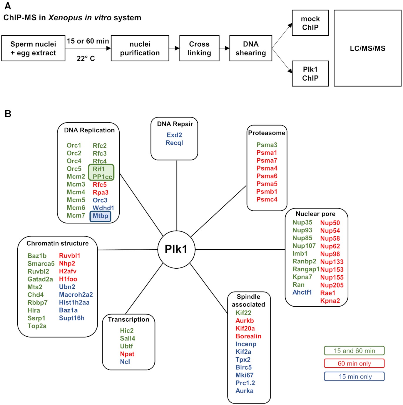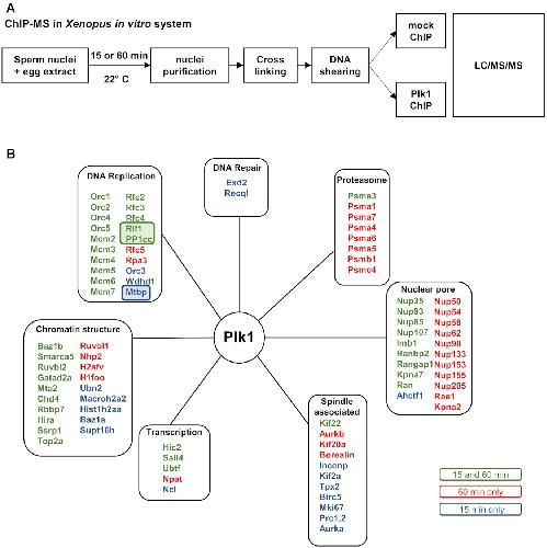 Figure 7. ChIP mass spectroscopy reveals potential Plk1 interactions with DNA replication proteins. (A) Experimental diagram of the ChIP MS approach from the Xenopus in vitro system after 15 min (pre-RC assembly) and 60 min (ongoing replication) incubation of sperm nuclei (4000 nuclei/μl) in egg extracts. (B) Identified nuclear proteins enriched more than 3-fold (spectral counts) in Plk1- versus mock-ChIP were classified into various functional groups according to GO-term location and functions retrieved from Uniprot database manually curated. |