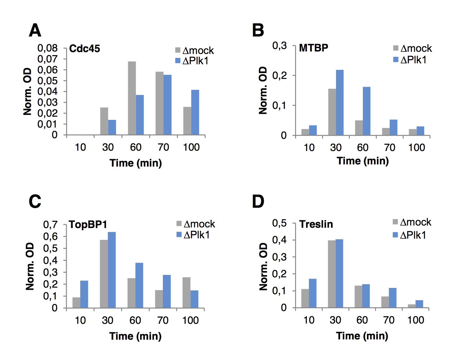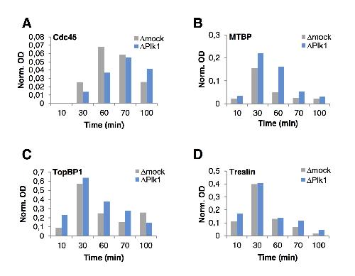 Supplementary Figure S6 Plk1 depletion decreases Cdc45 and increases TMT levels on chromatin. Quantification of optical densities (OD) of blots in Fig.5 C, normalized to Orc2 levels. |