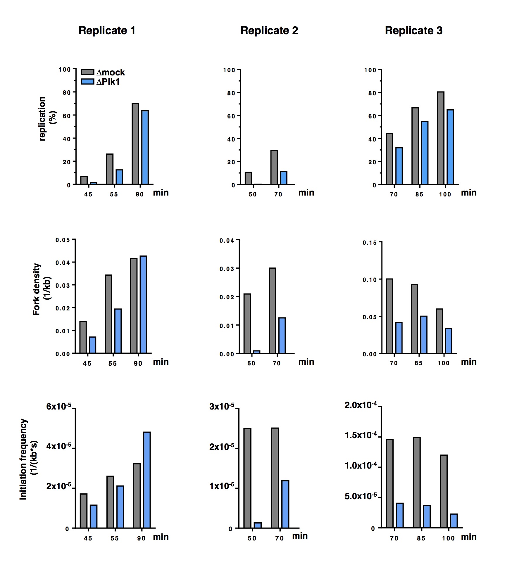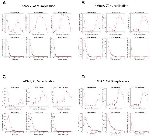 Supplementary Figure S1 Plk1 depletion induces a decrease in replication extent, fork density and initiation frequency in three independent DNA combing replicates. Plots from values presented in Figure 1C, analysis performed as described in Material and Methods Section. |
