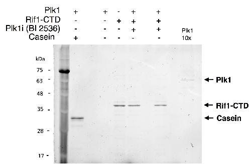 Supplementary Figure S10 Plk1 phosphorylates Rif1 in vitro. Stain-Free detection (Bio-Rad) as loading control of the phosphorylation reaction shown on Fig. 8 C. Samples were withdrawn from the assembled reaction just prior to [g32P]-ATP addition and run on SDS-PAGE. |