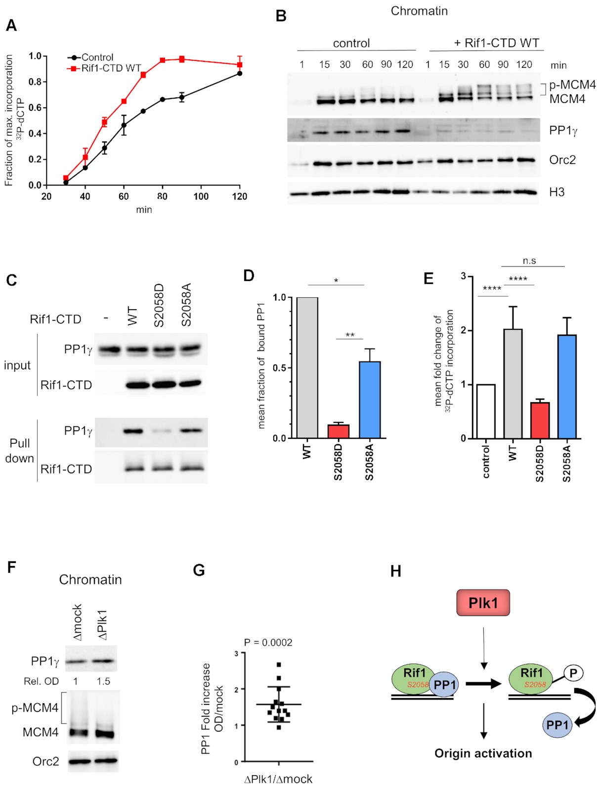 Figure 9. Rif1âCTD accelerates DNA replication dependent on PP1 interaction with Rif1-S2058. (A) Rif1âCTD or buffer was added to sperm nuclei (2000 nuclei/μl) replicating in egg extracts in the presence of [α 32P]-dCTP, DNA was purified at indicated times and replication was analyzed on alkaline gel electrophoresis, the mean incorporation with SEM from two independent experiments was plotted. (B) Rif1âCTD or buffer was added to sperm nuclei replicating in egg extracts, chromatin was purified at indicated times, specified proteins were analyzed by western blotting. (C) Buffer (-), wild type (WT), 1 μM Rif1âCTD mutants respectively (S2058D) and (S2058A) were added to egg extracts, recovered by pull-down after 1h incubation using Ni-magnetic beads, then analyzed by western blotting using anti-PP1 (PP1γ) or anti-Rif1 (Rif1âCTD) antibodies. (D) PP1 bound to Rif1âCTD was quantified, normalized to Rif1, and expressed as mean fraction with SEM of PP1 bound to WT Rif1âCTD in three independent experiments, unpaired or one sample t-test. (E) As in (A) WT, S2058D and S2058A Rif1âCTD were incubated in replicating reactions and [α 32P]-dCTP incorporation was quantified after DNA gel electrophoresis then plotted as mean fold increase compared to control (buffer) with SEM, in 3 (for WT, S2058D) or 5 (for WT, S2058A) independent experiments with different time points within (n = 9, n = 15 respectively), Mann-Whitney test. (F) Rif1âCTD or buffer was added to sperm nuclei (2000 nuclei/μl) replicating in mock- (Îmock), or Plk1- (ÎPlk1) depleted extracts, chromatin was purified after 60 min and indicated proteins were analyzed by western blotting. (G) Fold increase of chromatin bound PP1 normalized to Orc2 OD on western blots in Plk1- versus mock- depleted extracts from five different replication reactions with different time points, scatter dot blot with mean (n = 13), Wilcoxon signed ranked test, P-value above blot. (H) Model of Plk1 regulating origin activation via phosphorylation of Rif1 which interrupts the Rif1-PP1 interaction. |
