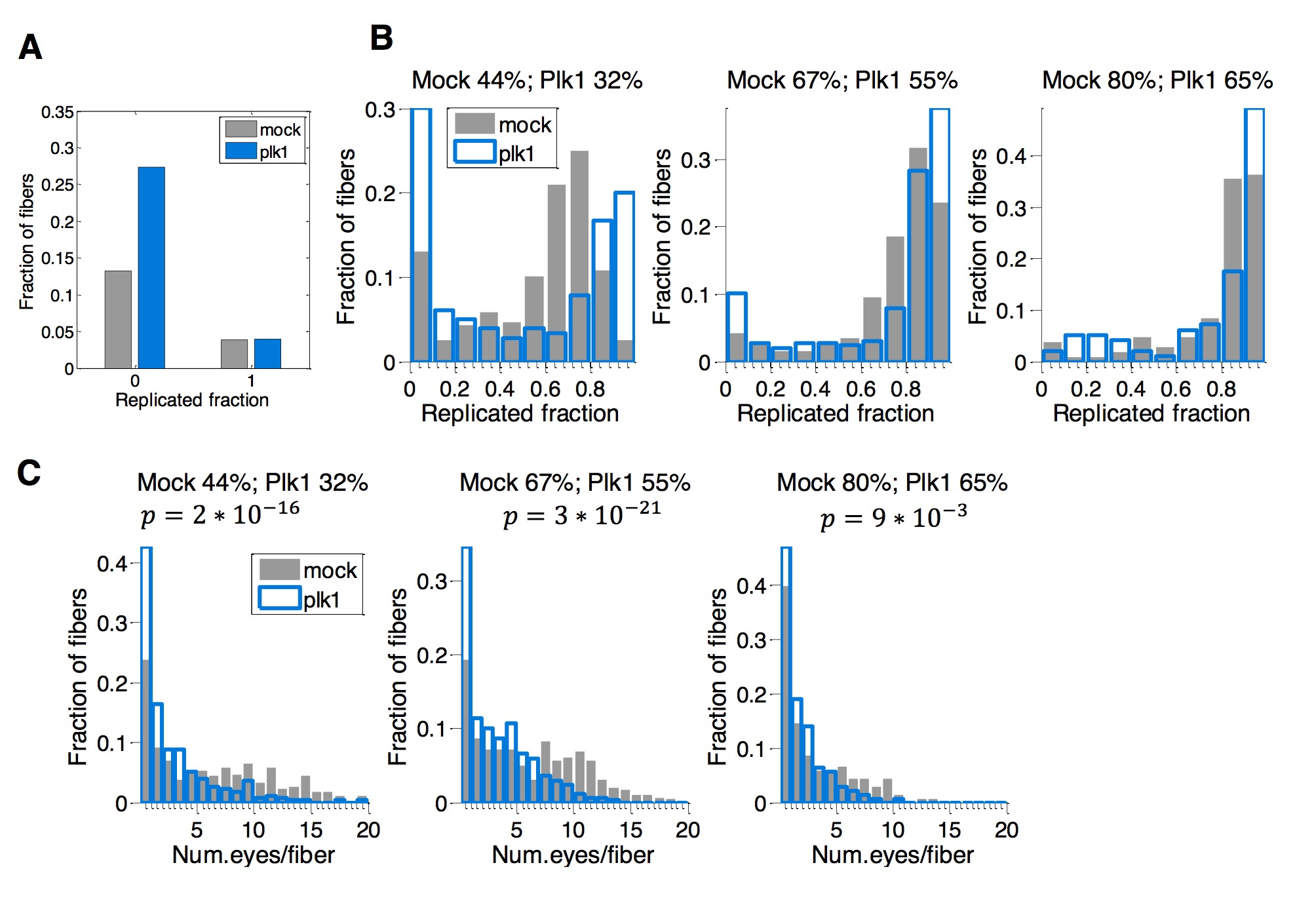 Supplementary Figure S4 Supplementary combing analysis. (A) fraction of fibers with only 0 % or 100 % replication per fiber in mock and Plk1 depleted conditions of experiment in Fig. 2A, B. (B) distribution of replicated fraction per fibers in mock and Plk1 depleted conditions (except fibers with 0 and 1 replicated fractions) in three time points. The graphs show over-representation of low and high replication extents after Plk1 depletion. (C) 0.2 Distributions of number of eyes pe0r.2fiber. It shows that after Plk1 depletion fibers with more 0th.1an 5-7 eyes are underrepresented , P values from Mann-Whitney U-test. |