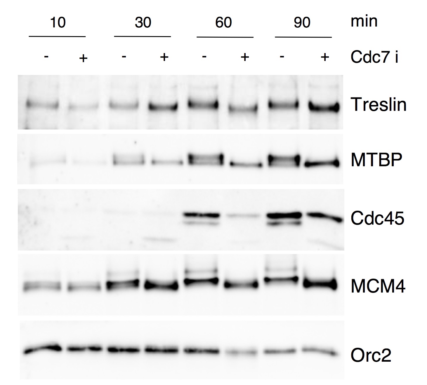 Supplementary Figure S8 DDK inhibition leads to a mobility shift of chromatin bound MTBP and Treslin throughout S phase. Complete time course experiment of Fig.6E, showing additional time points, 10, 30 and 90 min to better appreciate the reproducibility of mobility shifts during S phase. |