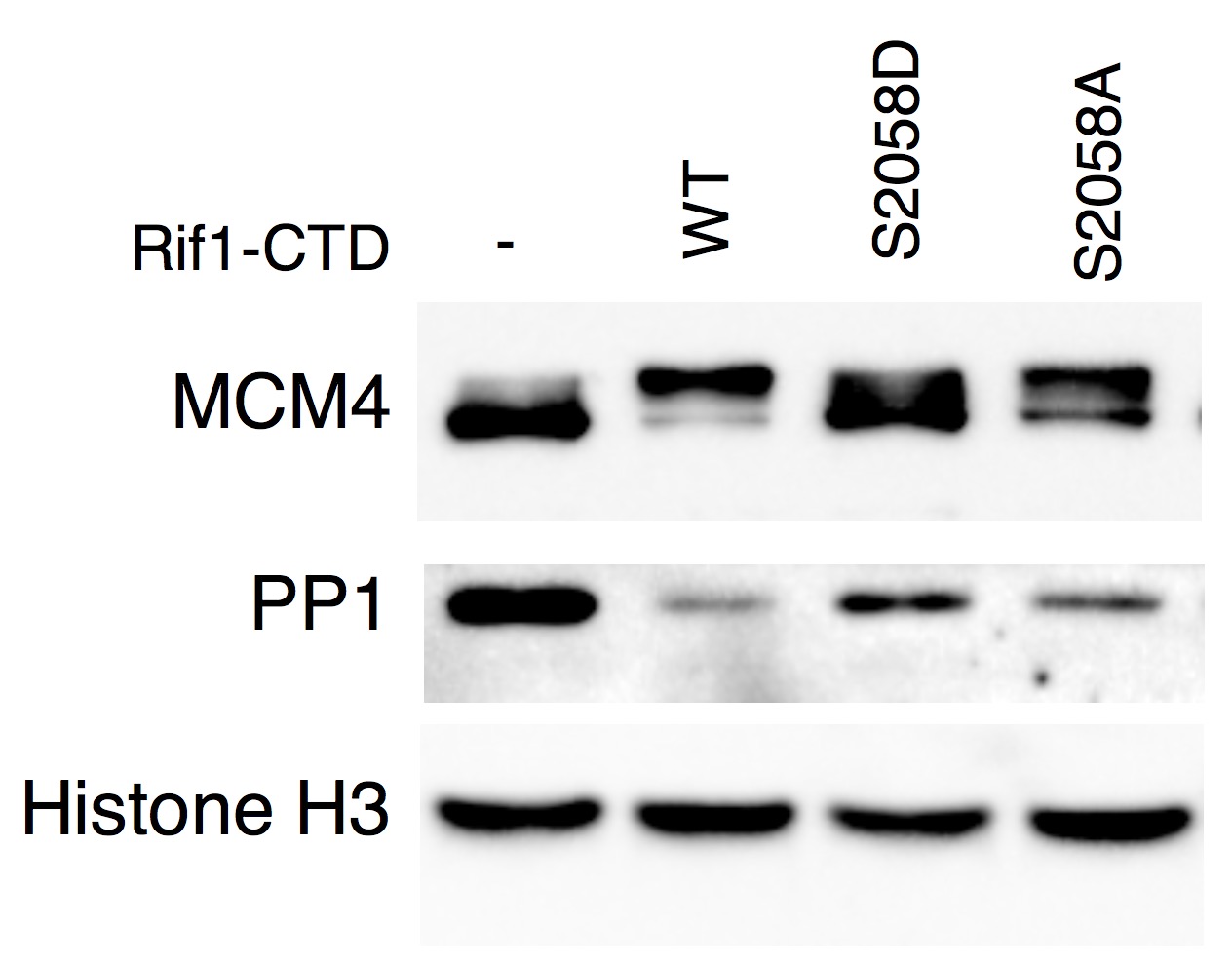 Supplementary Figure S11 Effect of Rif1-CTD WT (wild-type), S2058D and S2058A mutant on chromatin-bound PP1 and MCM4. Experiment as in Fig.9C, but equivalent amounts of WT or mutants were added to replication reactions, chromatin was purified after 60 min and immuno-blotted with indicated antibodies, Histone H3 as loading control. |