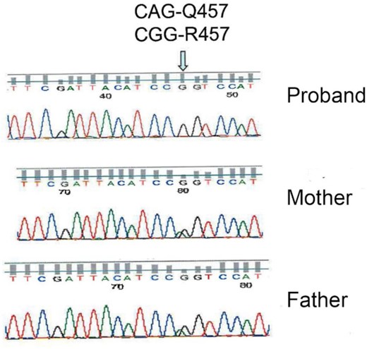 Figure 2. Sanger sequencing of child with GGM and his parents. The proband has a CGG-R457 mutation, while the mother and father are heterozygotes.