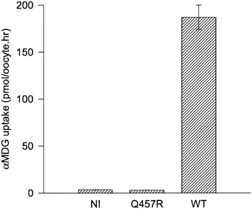 Figure 3. αMDG uptake by WT and Q457R mutant SGLT1. Oocytes were injected with 50 nl (1 µg/µl) of cRNA coding for WT or Q457R mutant SGLT1. After 3 days, uptake of 50 µM 14C-αMDG was measured. Values represent the mean of 8 oocytes and the error bars indicate the standard error. Q457R mutant uptake was not different from uptake by NI oocytes, 1.7% of the WT uptake (3 vs. 180 pmoles/h/oocyte).