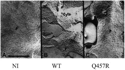 Figure 5. (Freeze-fracture) P fracture face of the plasma membrane of a NI oocyte and oocytes injected with Q457R or WT cRNA. NI oocyte (A) showed 7-nm-diameter particles in the P-face at a density of 200/mm2, whereas in WT injected oocyte (B), the density of particles increased to 1000/mm2. Similar density was obtained in Q457R cRNA injected oocytes (C). Q457R injected oocyte is the same as the one in Figures 7B and 8A. The 25 mM Na+/glucose current was â800 nA at â50 mV for the WT oocyte and 0 for Q457R (Figure 7); the SGLT1 charge movements were 8.5 and 3.7 nC (Figure 8A). Scale bar 200 nanometers.