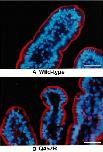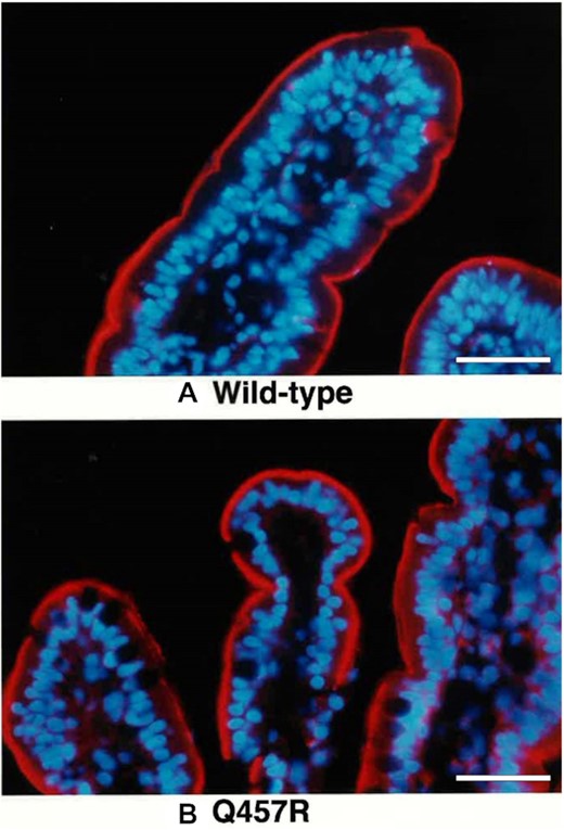 Figure 6. Immunolocalization of SGLT1 protein in human small intestine of a normal (control) (A) and a GGM patient (9) with the Q457R missense mutation (B). Double staining procedures shows SGLT1 (red) as a sharp line localized to the brush border of the enterocytes and the basal nucleus stained in blue. Goblet cells between the enterocytes were unstained for SGLT1. There were no differences in location of SGLT1 in enterocytes from the normal and the GGM (magnification x125). In a separate case of GGM, C292Y, the mutant protein did not reach the brush border membrane and was trapped just above the nuclei.14 Scale bar 30 micrometers.