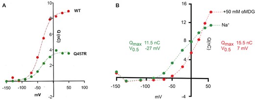 Figure 8. A. Charge-voltage (Q/V) relationships for WT and Q457R SGLT1. A. Charge was obtained by integration of SGLT1 current transients in the absence of sugar (see methods). The symbols correspond to the experimental data after the subtraction of the NI oocyte values, and normalized to WT charge at + 50 mV. The dotted lines are drawn according to the Boltzmann relation. Mutant Qmax (maximal charge transfer) was 40% of the WT value (3.7 ± 0.2 vs. 8.8 ± 0.3 nC). The V0.5 values were â47 and â50 mV, and z 1.4. B. Q/V relationships of Q457R SGLT1 in the absence and in the presence of the 50 mM αMDG. Q was obtained by the integration of current transients in the absence and in the presence of 50 mM αMDG. The symbols correspond to the experimental data and the curves are drawn according to the Boltzmann relation. The addition of 50 mM αMDG induced an increase of Qmax, from 11.5 to 15.5 nC, and a shift of V0.5 from â27 to + 7 mV, but no change in z (1.1).