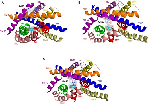 Figure 10. Molecular model showing sugar-binding site of WT hSGLT1 and mutant Q457R. The molecular models of the outward and inward-facing conformations of hSGLT1 were based on the crystal structures of the sodium sialic acid symporter SiaT from Proteus mirabilis (PDB ID 5NV9) and the sodium glucose cotransporter vSGLT from Vibrio parahaemolyticus (PDB ID 3DH4).34 Computational and experimental approaches were used to validate the homology models. A sugar-binding site in outward open conformation. The sugar coordinating residues Q457, H83, Y290, N78, and E102 are not shown. Note that Q457R does not interact with sugar in this conformation. B. The sugar-binding site in the inward conformation. Note that the inward tilt of TM10 positions Q457 to interact with the pyranose oxygen and the C#6 –OH of glucose. C. Sugar binding site for mutant Q457R in the inward conformation. Note that in this conformation the side-chain of Arg457 encounters steric hindrance to binding with glucose.