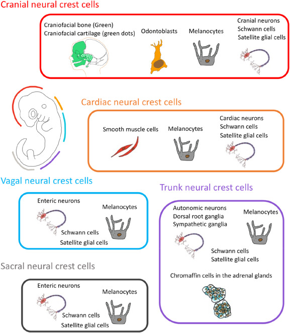 Fig. 1. Overview of NCCs differentiation along the anteriorâposterior axis of the embryo. Only cranial NCCs can differentiated into bone and cartilage in addition to melanocyte, cranial neurons and glial cells and odontoblasts. Cardiac NCCs migrate into 3rd-6th pharyngeal arches and give rise to aorticopulmonary septum, smooth muscle of the aorta and pulmonary artery and valvular tissue and cardiac neurons. Vagal and Sacral NCCs consists of enteric nervous system. Trunk NCCs migrate dorsolateral and ventrolateral. The former group give rise to melanocyte and the latter give rise to chromaffin cells, known as endocrine cells in adrenal glands, and the neurons of the sympathetic nervous system.