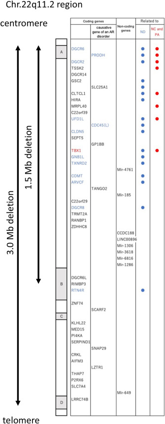 Fig. 2. Schematic overview of genes in the 22q11.2 critical region. Schematic overview of 3 Mb in the 22q11.2 region. The gray columns A, B, C, D indicate blocks of low-copy repeats, named LCR22s. Breakpoints of the deletion mostly occur in these LCR22s. Eighty-five percent of patients with chr.22q11.2 deletion syndrome have a 3 Mb deletion, and 5% harbor a 1.5 Mb deletion. Forty-four coding genes and 9 noncoding genes are located in this region. The genes listed in blue were reported to be associated with schizophrenia. TBX1 (shown in red) is known as a cardinal gene of chr.22q11.2 deletion syndrome. Eight coding genes were reported to cause autosomal recessive syndromes. ND: neural development, NC: neural crest, PA: pharyngeal arches.