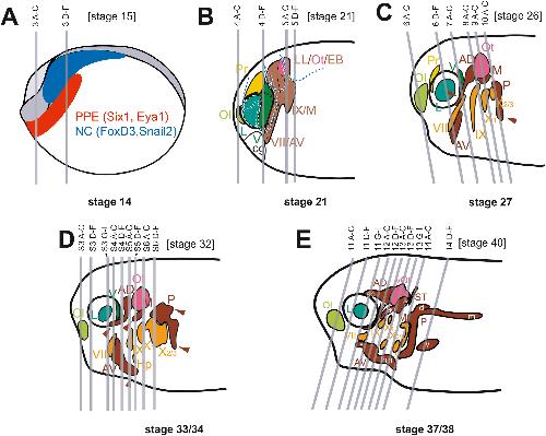 Fig. 2. Levels of sections. Approximate level and orientation of sections and figure and panel numbers are indicated on schematic drawings of Xenopus embryos at various stages of development The stage of the embryos sectioned and depicted in Fig. 2, Fig. 3, Fig. 4, Fig. 5, Fig. 6, Fig. 7, Fig. 8, Fig. 9, Fig. 10, Fig. 11, Fig. 12, Fig. 13, Fig. 14 and Fig. Suppl. 3â6 (S3âS6) is indicated in square brackets and deviates slightly from the stages depicted in the schematic drawings. Sensory ridges growing out of lateral line placodes are marked by brown arrowheads (C, D) or white asterisks (E) and are labelled with white letters in E. Hypobranchial placodes are labelled with orange asterisks in E. Abbreviations: Ad/Ol: anterior placodal area, from which adenohypophyseal (Ad) and olfactory placodes (Ol) develop; AV: anteroventral lateral line placode; cg: cement gland; Hp1: first hypobranchial placode; L: prospective lens placode (hatched outline), lens placode or lens (invagination of placode between stage 27 and 33/34); LL/Ot/EB: posterior placodal area, from which lateral line (LL), otic (Ot), and epibranchial (EB) placodes develop; M: middle lateral line placode; NC: neural crest; Ol: olfactory placode; Ot: otic placode or vesicle (invagination of placode between stage 24 and 33/34); P: posterior lateral line placode; PPE: preplacodal ectoderm; Pr: profundal placode; V: trigeminal placode; VII: facial epibranchial placode; IX: glossopharyngeal epibranchial placode; X1: first vagal epibranchial placode; X2/3: second and third vagal epibranchial placodes (fused). Drawings modified from Schlosser and Northcutt (2000) and Schlosser and Ahrens (2004). |