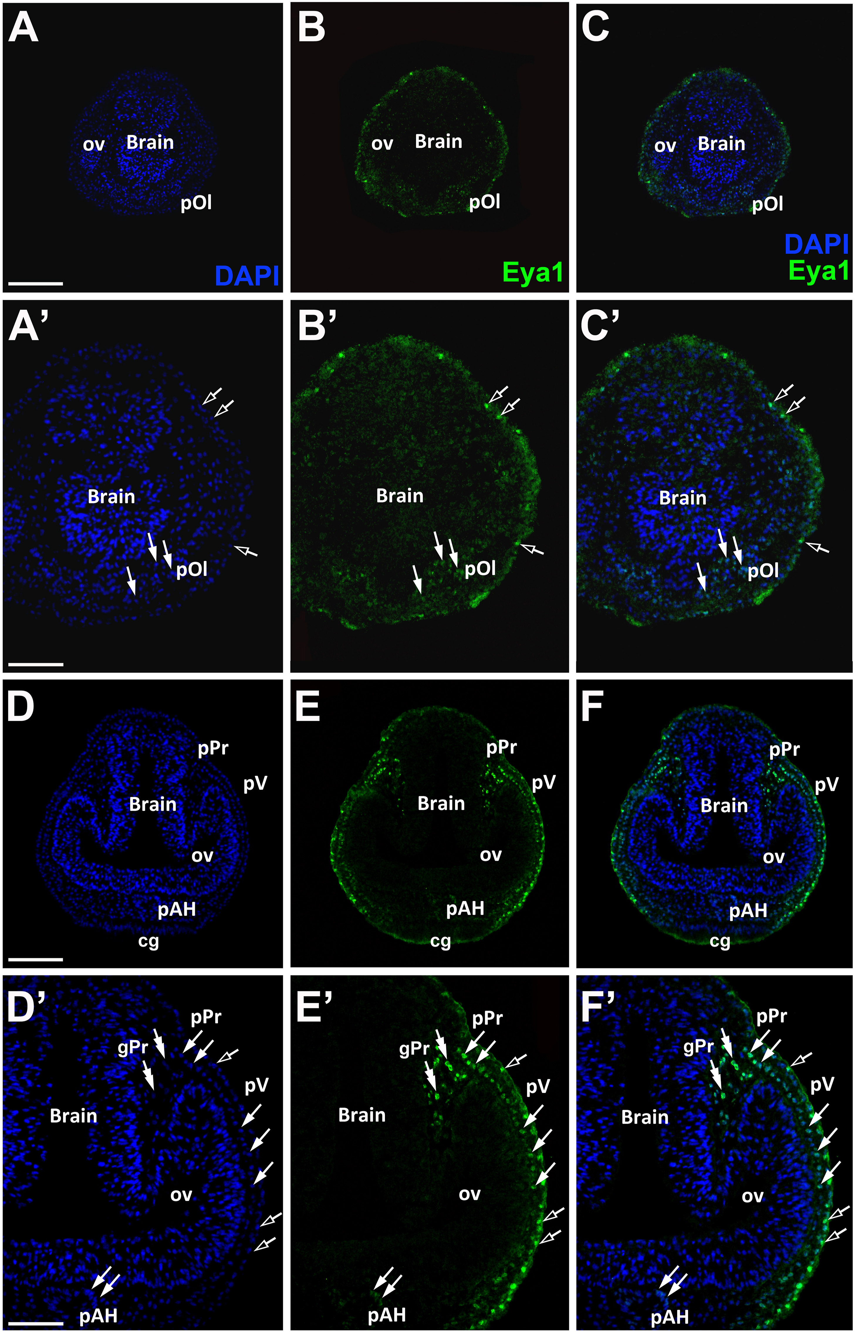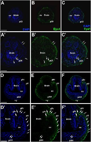Fig. 4. Eya1 distribution in transverse sections of Xenopus laevis at stage 21. Overview of stage 21 embryo showing nuclear DAPI staining (first column), Eya1 immunostaining (second column) and merged channels (third column) with higher magnification views shown in Aâ-Fâ. Eya1 . localizes to nuclei in placodes (arrows) and placode derived ganglia (double arrows). Eya is localized to nuclei in placodes (filled arrows) including olfactory placode (pOl), profundal placode (pPr) and ganglion (gPr), trigeminal placode (pV) and adenohypophyseal placode (pAH). Eya1 is also expressed in nuclei and apical cytoplasm of scattered cells in the superficial ectodermal layer (open arrows). Eya1 expression is undetectable in brain and optic vesicle (ov). Scale bars: A, D: 200 μm (for A-C and D- F); Aâ, Dâ: 100 μm (for Aâ-â, and Dâ-â) |