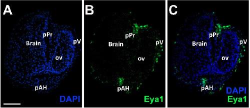 Fig. Suppl. 1. Eya1 distribution in transverse sections through anterior head of Xenopus laevis at stage 23. Nuclear DAPI staining (A), Eya1 immunostaining (B) and merged channel (C) is shown. Eya1 is localized to nuclei in the profundal placode (pPr), trigeminal placode (pP) and adenohypophyseal placode (pAH) Eya1 expression is undetectable in the brain and optic vesicle (ov). Scale bar in A:100 μm (for A-C). |