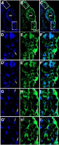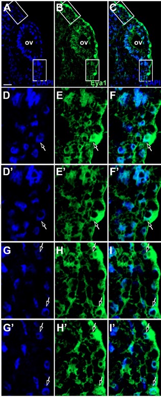 Fig. Suppl. 2. Subcellular localization of Eya1 protein in superficial ectoderm at stage 26. Immunostaining for Eya1 in a transverse section through otic level of a Xenopus embryo at stage 26 analyzed by confocal microscopy (dorsal to the top, medial to the left). Nuclear DAPI staining (first column), Eya1 immunostaining (second column) and merged channels (third column) are shown. A-C: Overview with maximum intensity projection through z-stack. D-Fâ: Magnified views of the lower boxed area shown in two different confocal planes (D-F, Dâ-Fâ; 0.9 μm between adjacent planes). G-Iâ: Magnified views of the upper boxed area shown in two different confocal planes (G-I, Gâ-Iâ; 0.9 μm between adjacent planes). Strongly Eya1-immunopositive nuclei in the superficial ectodermal layer indicated by open arrows. Note that Eya1 is also enriched in the cytoplasm between these nuclei and the apical surface of these cells. ov: otic vesicle. ¬Scale bar in A: 25 μm. |