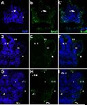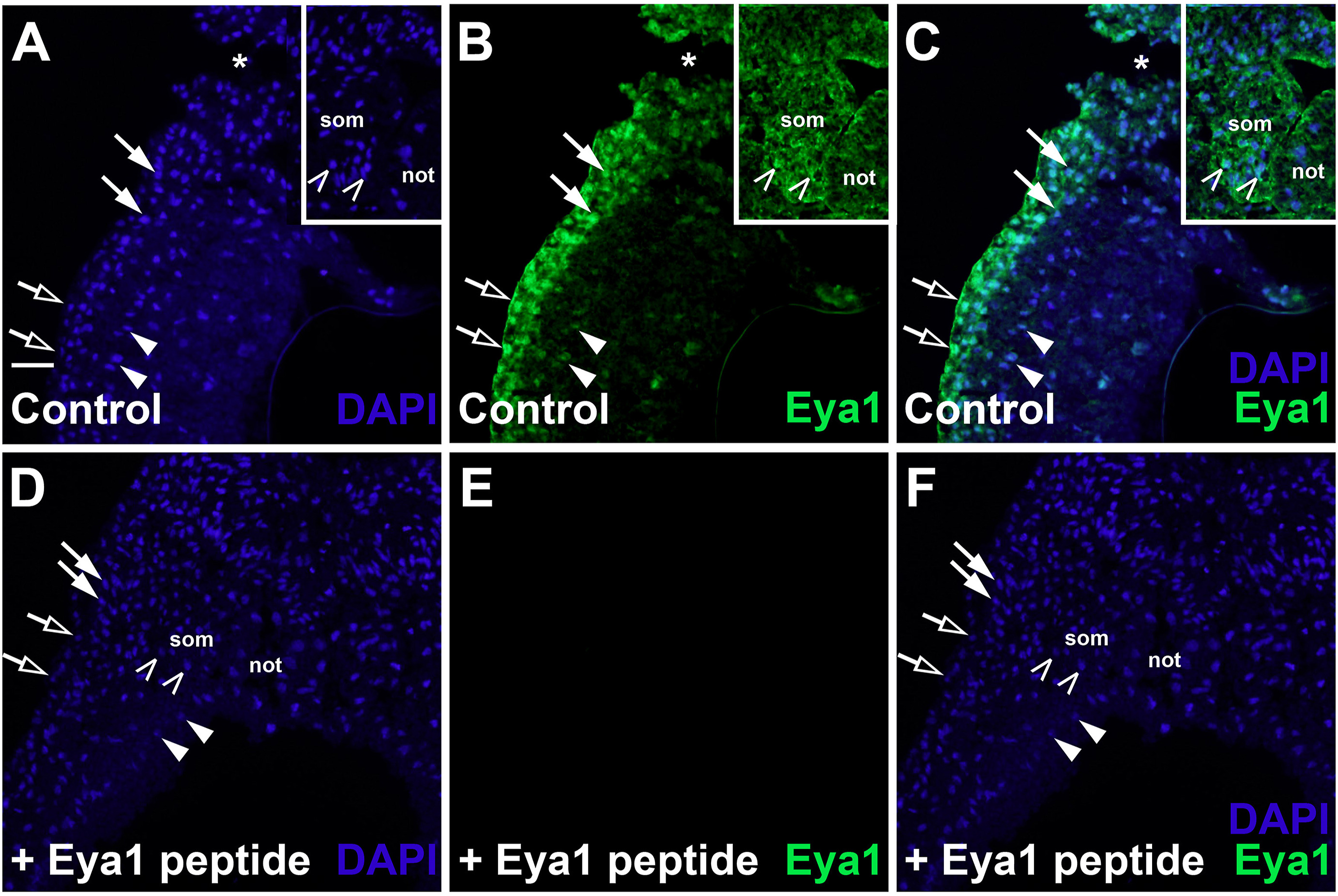 Fig. 1. Specificity of Eya1 antibodies. AâF: Peptide competition assay for anti-Eya1 GP1 antibody. Transverse sections through the left otic vesicle of a Xenopus embryos at stage 20 analyzed in single confocal planes (dorsal to the top, medial to the right). Different channels of same section shown in A-C and D-F. Insets in A-C show expression of Eya1 in nuclei and cytoplasm in somites in another section. Arrows indicate nuclear expression in placodes, open arrows indicate nuclear expression in the surface layer of the ectoderm, arrowheads indicate nuclear expression in pharyngeal endoderm, open arrowheads indicate nuclear expression in somites. Asterisk indicates a sectioning artefact (tear). All domains of Eya1 immunostaining as evident in control embryos (A-C) are blocked after addition of Eya1 peptide (5 μg peptide/1 μg Eya1 antibody; D-F). Not: notochord; som: somite. Scale bar in A: 50 μm (for all panels). |