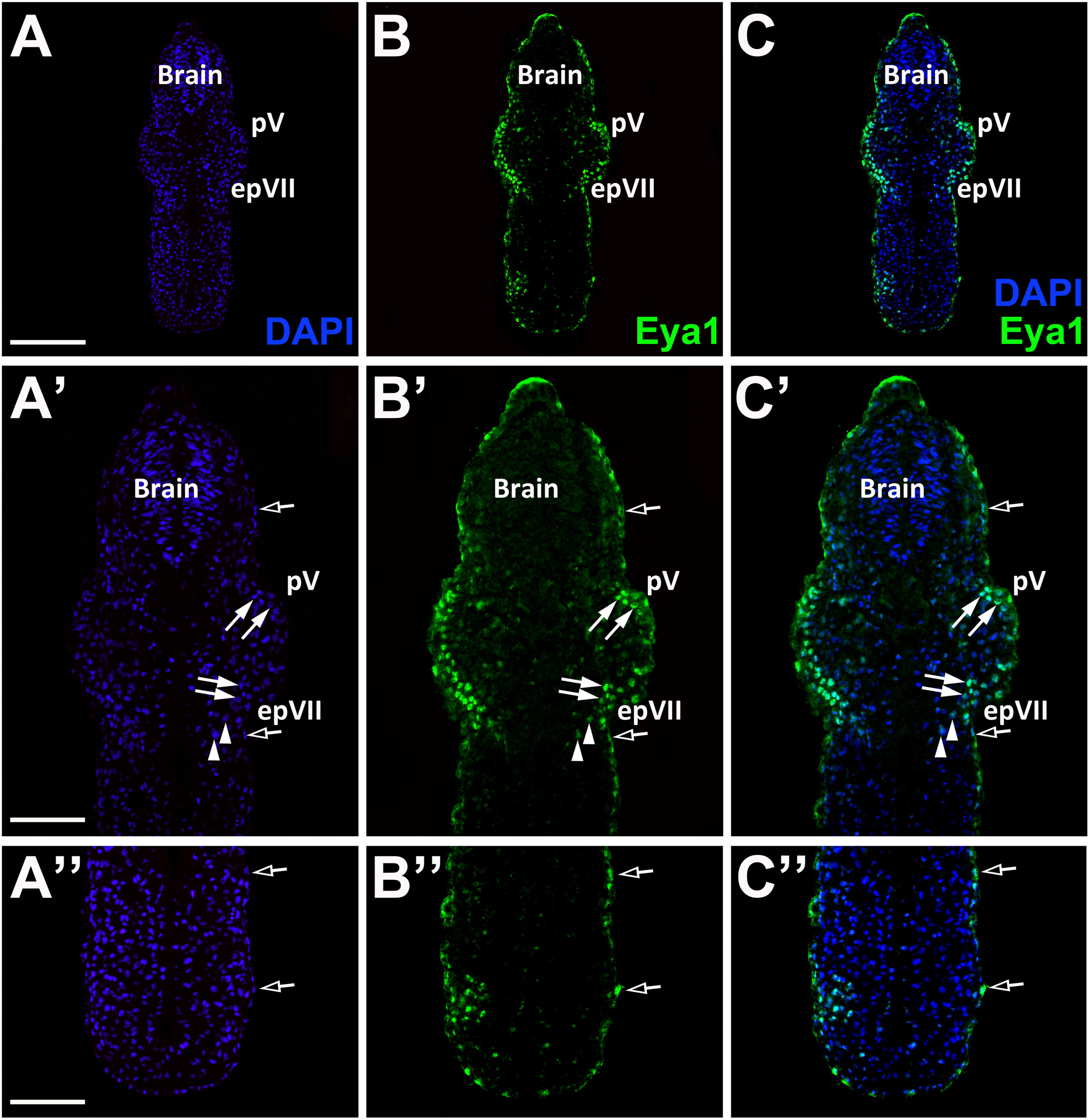 Fig. 7. Eya1 distribution in transverse sections of Xenopus laevis at stage 26 (cont.). A-C: Overview of stage 26 embryo showing nuclear DAPI staining (first column), Eya1 immunostaining (second column) and merged channels (third column) with higher magnification views shown in Aâ-Câ. Eya1 is localized to nuclei in placodes (filled arrows) and endoderm (arrowheads). Eya1 is also expressed in nuclei and apical cytoplasm of scattered cells in the superficial ectodermal layer (open arrows). Eya1 is expressed in trigeminal placode (pV) and facial epibranchial placode (epVII), Eya1 expression is undetectable in brain. Scale bars: A: 200 μm (for A-C); Aâ,ââ: 100 μm (for Aâ-â, Aââ-ââ). |