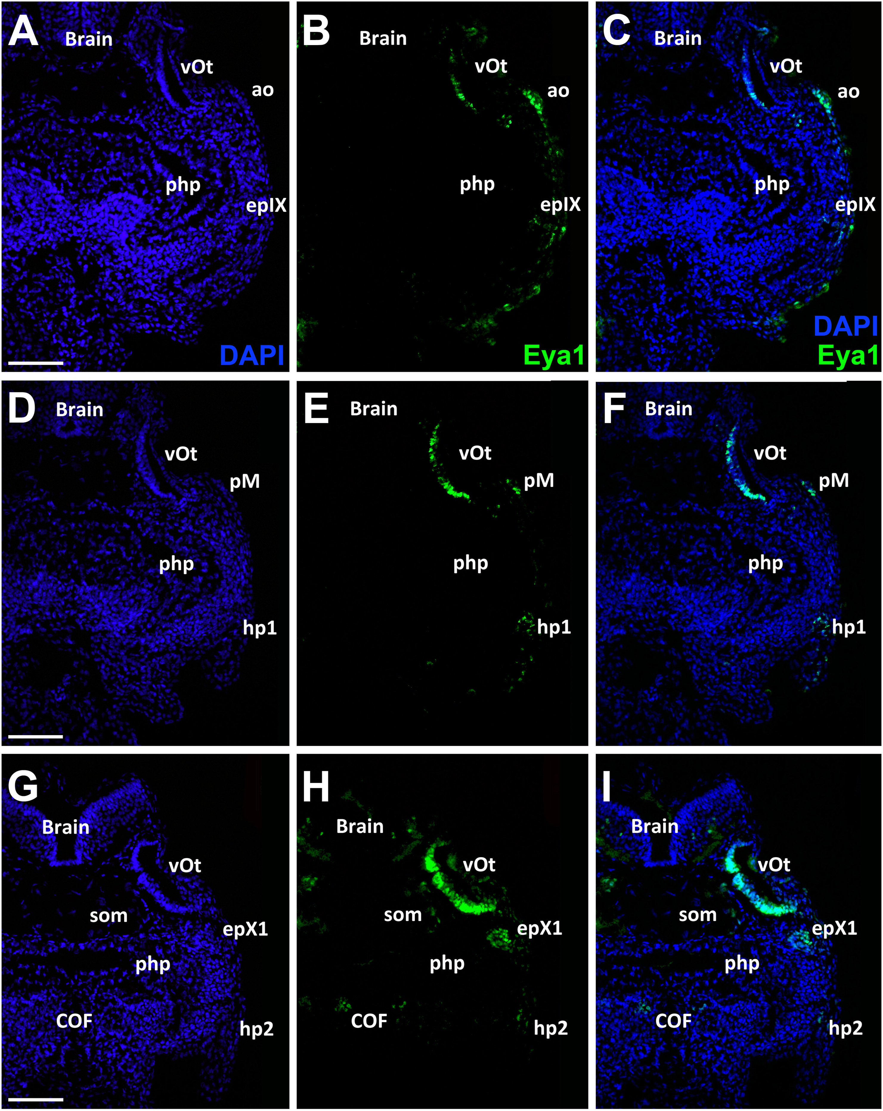 Fig. 13. Eya1 distribution in transverse sections of Xenopus laevis at stage 40 (cont.). A-I: Overview of stage 40 tadpole showing nuclear DAPI staining (first column), Eya1 immunostaining (second column) and merged channels (third column). Eya1 is expressed in otic vesicle (vOt), middle lateral line placode (pM), aortic lateral line (ao), the first vagal epibranchial placode (epX1), first hypobranchial placode (hp1), second hypobranchial placode (hp2), somites (som) and cardiac outflow (COF). Eya1 expression is undetectable in brain and pharyngeal pouches (php). Scale bars: A, D, G: 100 μm (for A-C, D-F and G-I). |