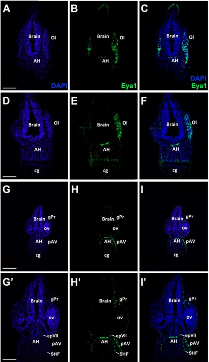 Fig. Suppl. 3. Eya1 distribution in transverse sections of Xenopus laevis at stage 32. A-C, G-I: Overview of stage 32 embryo showing nuclear DAPI staining (first column), Eya1 immunostaining (second column) and merged channels (third column) with higher magnification views shown in Aâ-Câ and Gâ-Iâ. Eya1 is expressed in olfactory placode (pOl), adenohypophysis (AH), profundal ganglion (gPr), anteroventral lateral line placode (pAV) and the mesoderm of the secondary heart field (SHF). Eya1 expression is undetectable in brain, optic vesicle (ov) and cement gland (cg). Scale bars: A, D, Gâ: 100 μm (for A-F); G: 200 μm (for G-I). |