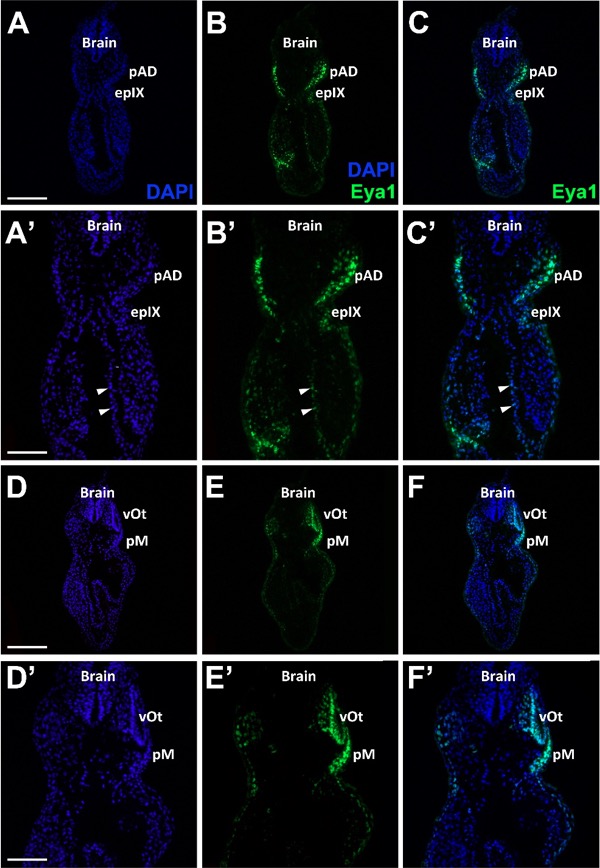 Fig. Suppl. 5. Eya1 distribution in transverse sections of Xenopus laevis at stage 32 (cont.). A-C, D-F Overview of stage 32 embryo showing nuclear DAPI staining (first column), Eya1 immunostaining (second column) and merged channels (third column) with higher magnification views shown in Aâ-Câ and Gâ-Iâ. Eya1 is expressed in anterodorsal lateral line placode (pAD), middle lateral line placode (pM), a glossopharyngeal placode (epIX), the otic vesicle (vOt) and some endodermal cells (arrowheads). Eya1 expression is undetectable in brain. Scale bars: A, D: 200 μm (for A-C, D-F); Aâ, Dâ: 100 μm (for Aâ-Câ, Dâ-Fâ). |