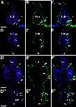 Fig. 14. Eya1 distribution in transverse sections of Xenopus laevis at stage 40 (cont.). A-F: Overview of stage 40 tadpole showing nuclear DAPI staining (first column), Eya1 immunostaining (second column) and merged channels (third column). Eya1 is expressed in posterior lateral line placode (pP), supratemporal lateral line placode (pST), the sensory ridges of middle trunk line (m) and ventral trunk line (v) and in somites (som). Eya1 expression is undetectable in brain. Scale bars: A, D: 100 μm (for A-C and D-F). |