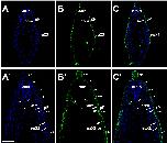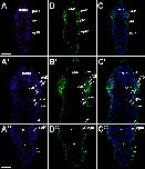 Fig. 8. Eya1 distribution in transverse sections of Xenopus laevis at stage 26 (cont.). A-C: Overview of stage 26 embryo showing nuclear DAPI staining (first column), Eya1 immunostaining (second column) and merged channels (third column) with higher magnification views shown in Aâ-Câ. Eya1 is localized to nuclei in placodes (filled arrows) and endoderm (arrowheads). Eya1 is also expressed in nuclei and apical cytoplasm of scattered cells in the superficial ectodermal layer (open arrows). Eya1 is expressed in anterodorsal lateral line placode (pAD), the invaginating otic vesicle (vOt; asterisk indicates lumen), the middle lateral line placode (pM) and glossopharyngeal epibra |