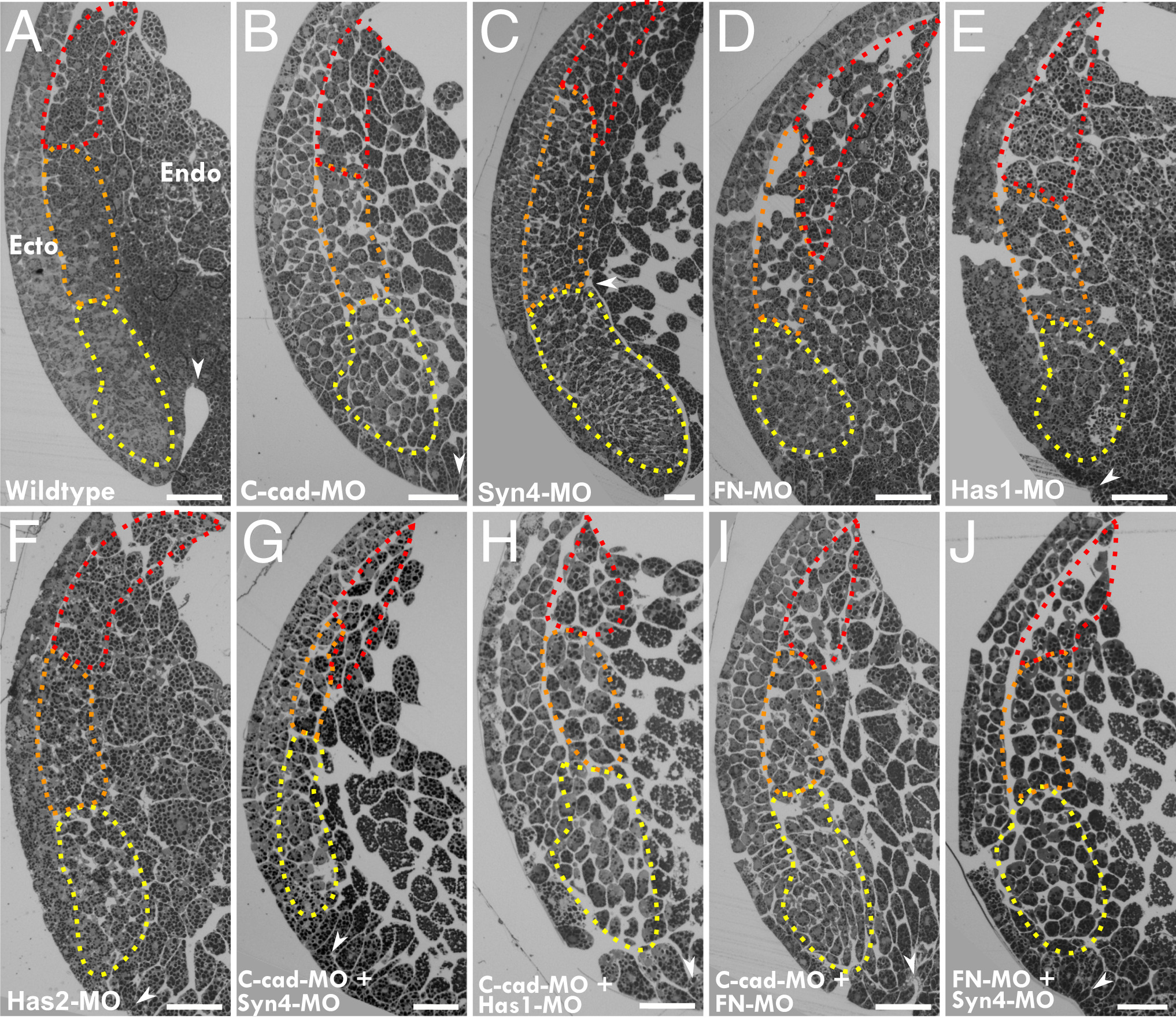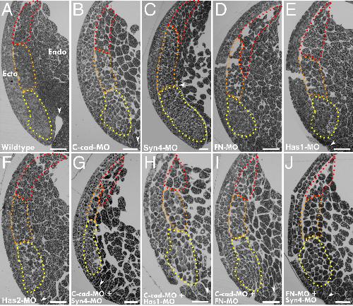 Fig. 3. Knockdown of adhesion factors disrupts cell contact patterns. (A–J) Semithin sections of single and double morphant Xenopus gastrulae. Ecto, ectoderm, Endo, endoderm. Dotted outlines demarcate leading-edge mesendoderm (red), prechordal mesoderm (orange), and chordamesoderm (yellow). White arrowheads indicate tip of archenteron invagination. Invagination is almost completely inhibited in treated embryos except in C, where it is increased. Dorsal is to the Left, animal to the Top. (Scale bars, 100 μm.) |