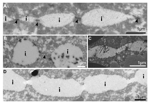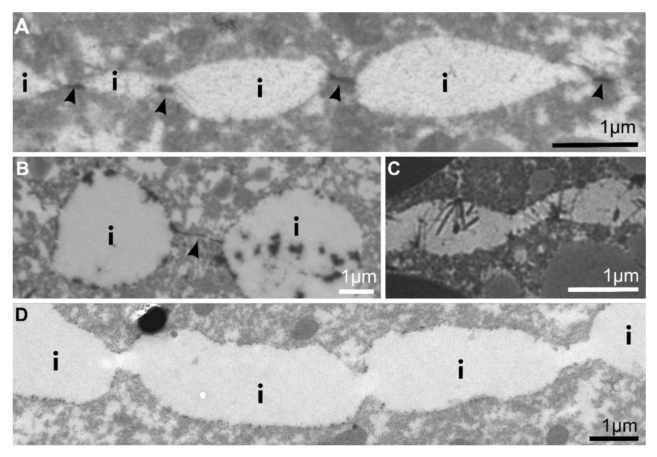 Supplementary figure 1. TEM images of lanthanum-stained contacts. (A, B) Stitch contacts connecting cells by thin, taut processes (arrowheads). (C) Alternation of glycocalyx bushes leading to asymmetric contacts on opposite membranes. (D) Wide stitch contacts between ectoderm cell (top) and mesoderm cell (bottom) in La3+ stained Syn-4 morphant. (i), interstitial gaps. Black arrowheads indicate La3+ stained stretches. |