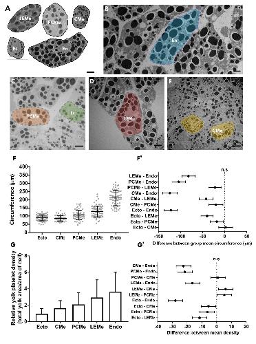 Supplementary figure 2. Identification of Xenopus gastrula tissues in TEM images. (A-E) Distinct morphological characteristics of cells from ectoderm (Ec) (A, C), endoderm (En) (A, B), prechordal mesoderm (PCMe) (A, C), leading edge mesendoderm (LEMe) (A, D), and chordamesoderm (CMe) (A, E). Ectoderm cells are small, with the smallest yolk platelets and sparse pigment granules in the inner layers and more on the apical surface of the epithelial ectoderm (A, C). Endoderm cells are the largest cells in the embryo and generally elongated along the animal-vegetal axis, containing the largest yolk platelets (A, B). Leading edge mesendoderm cells are smaller than endoderm cells but have large yolk platelets (A, D). Prechordal mesoderm cells are similar in size to mesendoderm cells but their yolk platelets are smaller than mesendodermal and larger ectoderm ones (A, C). Chordamesoderm cells are similar in size to ectoderm cells but contain a higher density of yolk platelets (A, E). (F-G’) Cell circumference (F) and yolk platelet density (G) are quantified to identify cells in TEM images. (F’-G’) 95% confidence intervals of circumference and density data. Dotted black lines, boundaries to statistically insignificant values. Error bars represent standard deviation of the mean. For specific p values, refer to Supplementary Table 1. Scale bars: 10μm. Ec: n = 73 cells, LEMe: n = 49, PCMe: n = 51, CMe: n = 60, En: n = 47; from 5 separate embryos. |