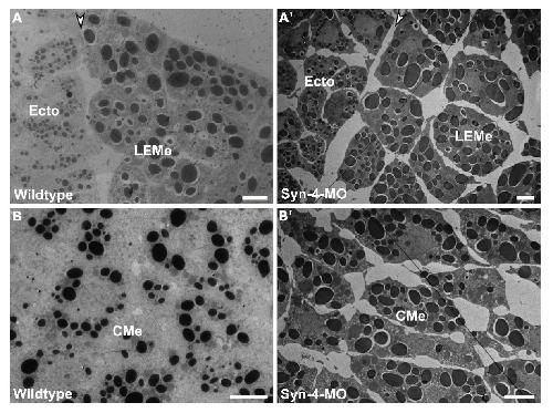 Supplementary figure 5. Cell shape in Syn-4 morphants. TEM images of wildtype (A, B) and morphant (A’, B’) ectoderm (Ecto) (A, A’), leading edge mesendoderm (LEMe) (A, A’) and chordamesoderm (B, B’). White arrowhead indicates the boundary between ectoderm and mesoderm. Scale bars, 10 μm. |