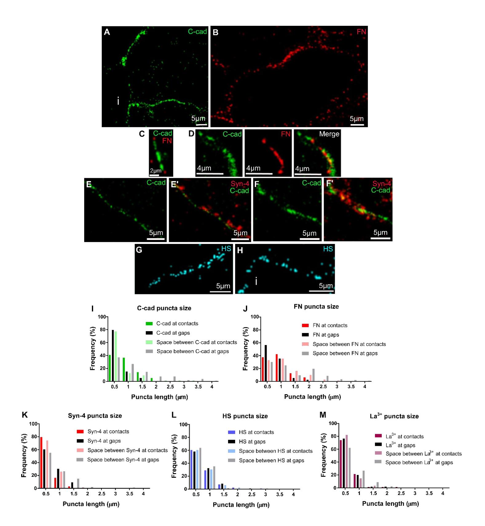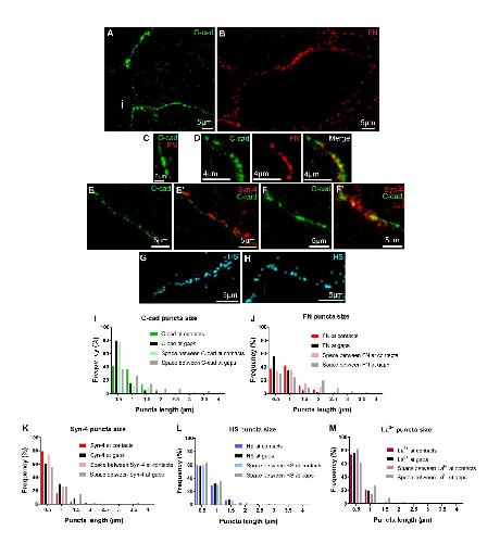 Supplementary figure 9. Adhesion factor puncta on the cell surface. (A-I) Immunofluorescence staining, and confocal microscopy reveal puncta of C-cadherin (C-cad; green), fibronectin (FN; red), syndecan-4 (Syn-4; red), and heparan sulfate (HS; blue) on the surface of prechordal mesoderm cells. Scale bars, 5 μm. (I-L) Lengths of puncta and spaces between puncta along cell surface, at contacts and at interstitial gaps as seen by confocal microscopy. (M) Lengths of lanthanum (La3+) stained stretches and spaces between stretches in TEM images of prechordal mesoderm. n= 427 puncta (C-cad), 460 (FN), 374 (Syn-4), 422 (HS), and 235 (La3+) puncta. |