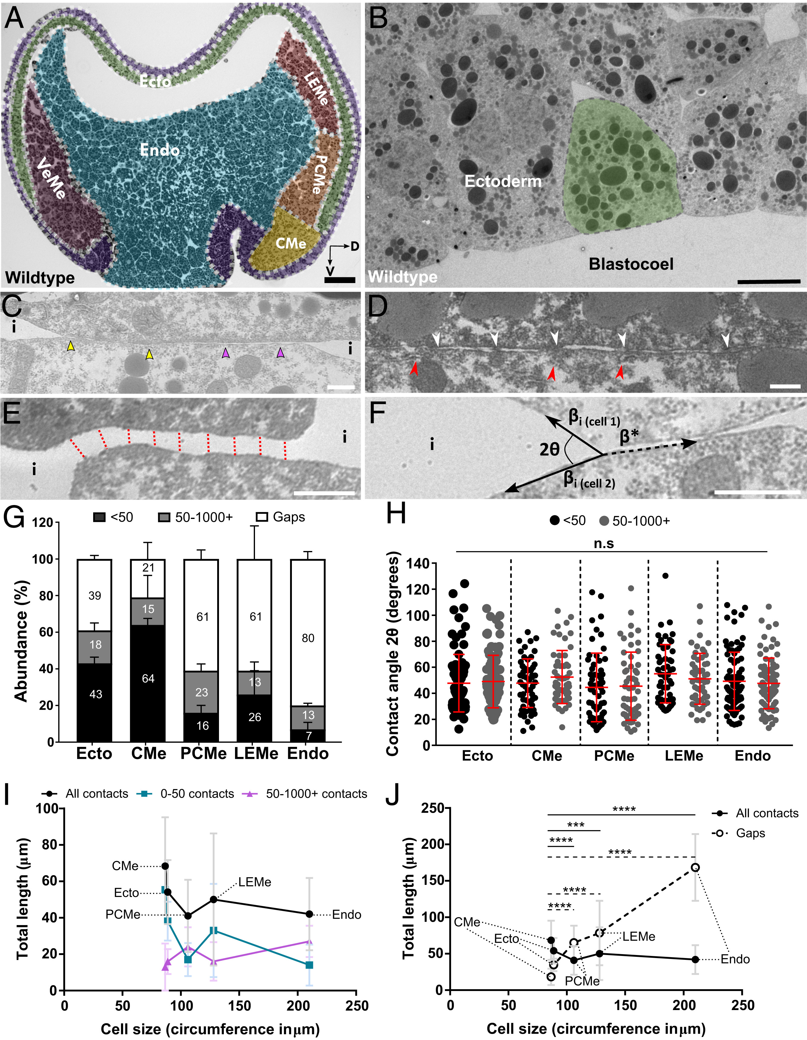 Fig. 1. Cell–cell contacts in the X. laevis gastrula. (A) Midsagittal semithin section of stage 11 Xenopus gastrula outlining dorsal tissues: Ectoderm (Ecto; green), chordamesoderm (CMe; yellow), prechordal mesoderm (PCMe; orange), leading-edge mesendoderm (LEMe; red), and endoderm (Endo; blue). Arrows: D, dorsal; V, vegetal. Epithelial layer, bottle cells (purple), and ventral mesoderm (VeMe; magenta) were not analyzed. (B–F) TEM images. (B) Ectoderm with cell highlighted in green. (C) Pair contact between interstitial gaps (i) with narrow (yellow arrowheads) and wide regions (purple arrowheads). (D) Narrow <50-nm contact with sections filled with dense material (white arrowheads) and membrane pits and membrane-adjacent elongate vesicles (red arrowheads). (E) Wide contact, width determined by measuring intercellular distance in 100-nm intervals (red dotted lines). (F) Contact angle 2θ between cells at the ends of contact (i). (G) Mean relative abundance of narrow (<50 nm) and wide (>50 nm) contacts and gaps. (H) Contact angles between cells as in F. (I and J) Total length of adhesive contacts and gaps as a function of cell circumference. Error bars represent SD of the mean. For P values refer to SI Appendix, Tables S2 and S3. n = 24 embryos for all tissues. P > 0.05 n.s., P < 0.05*, P < 0.01**, P < 0.001***, P < 0.0001****. (Scale bars: black, 100 μm in A; 10 μm in B; and white, 1 μm.) |