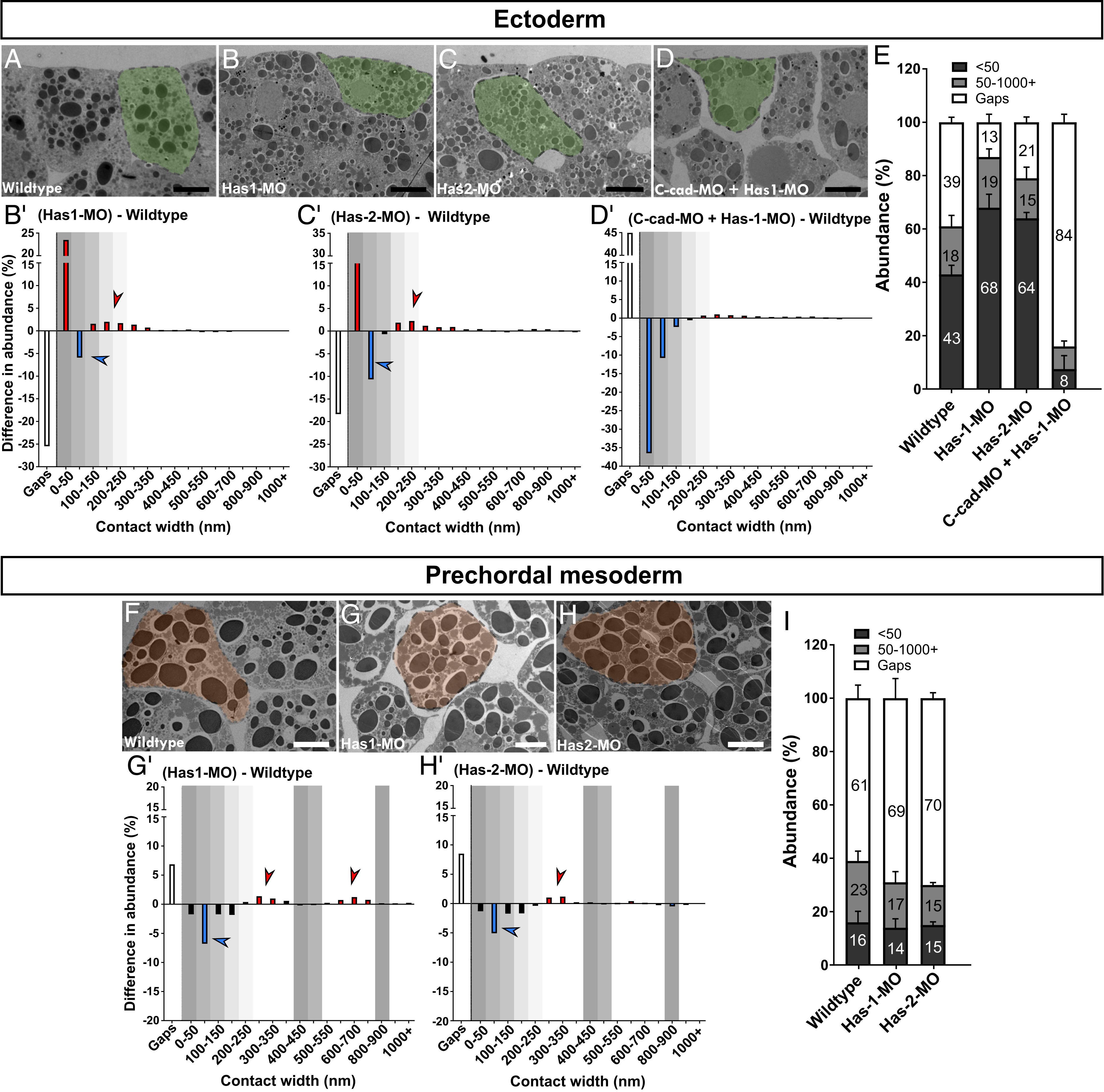 Fig. 6. Knockdown of HA synthases. (A–D and F–H) TEM images of wild-type and Has-1, Has-2, and C-cad/Has-1 morphant ectoderm and prechordal mesoderm; single cells are highlighted. (B′–D′ and G′–H′) Difference spectra for ectoderm and prechordal mesoderm. Colored columns show changes in abundance as in Fig. 4. (E and I) Abundance of narrow and wide contacts and of gaps. Error bars represent SD of the mean. For specific P values refer to Datasets S2 and S3. (Scale bars: black, 10 μm; white, 15 μm.) Wild type: n = 24 embryos; Has-1-MO: n = 10; Has-2-MO: n = 11; and C-cad-MO+Has-1-MO: n = 9. |