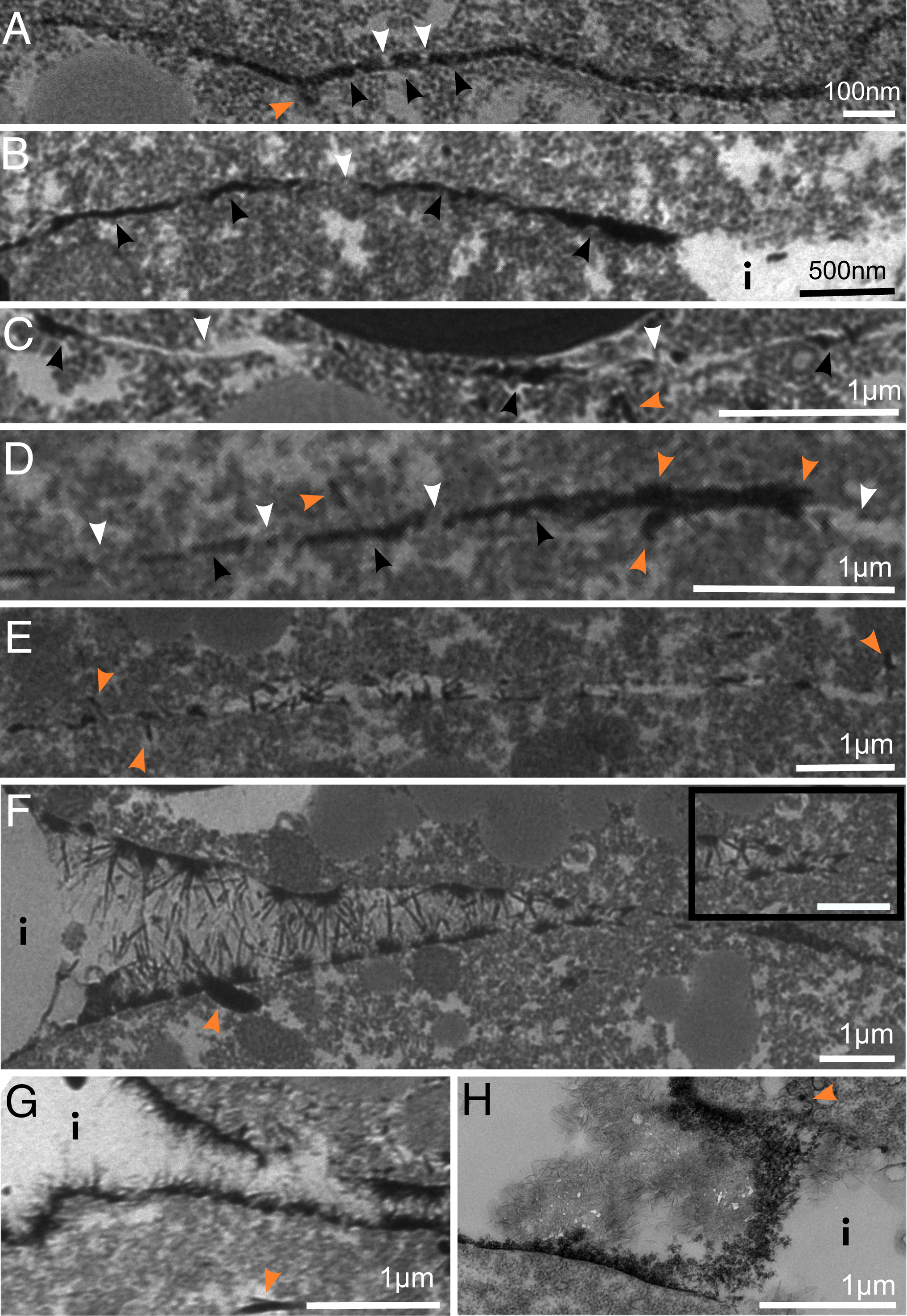 Fig. 8. La3+ staining of cell–cell contacts. (A) Narrow contact 15 to 30 nm wide. (B) La3+-stained contact increasing from 30 to 100 nm from Left to Right, ending at interstitial gap. (C) A 30- to 70-nm-wide contact with alternating La3+-stained and unstained stretches. (D) Homogeneously stained contact, width increasing from 40 to 120 nm, ending in unstained wide contact (Right). Patches of cytoplasmic staining are visible near the contact. (E) La3+-stained bush-like glycocalyx with thick fibrils in 125- to 250-nm-wide contact ending on the Right in unstained 125-nm contact. (F) Wide contact gradually opening into an interstitial gap. Bush-like glycocalyx with thick fibrils extending from dense plaques, often in alternating positions on opposite membranes (Inset). (G) A 350-nm-wide contact with fine fibrils emanating from dense plaques. (H) Micrometer-wide contact with fibril aggregates and dense plaques extending between opposing cell surfaces. Interstitial gaps, i. Black arrowheads indicate La3+-stained stretches; white arrowheads, unstained stretches; and orange arrowheads, cytoplasmic La3+ staining near contacts. |