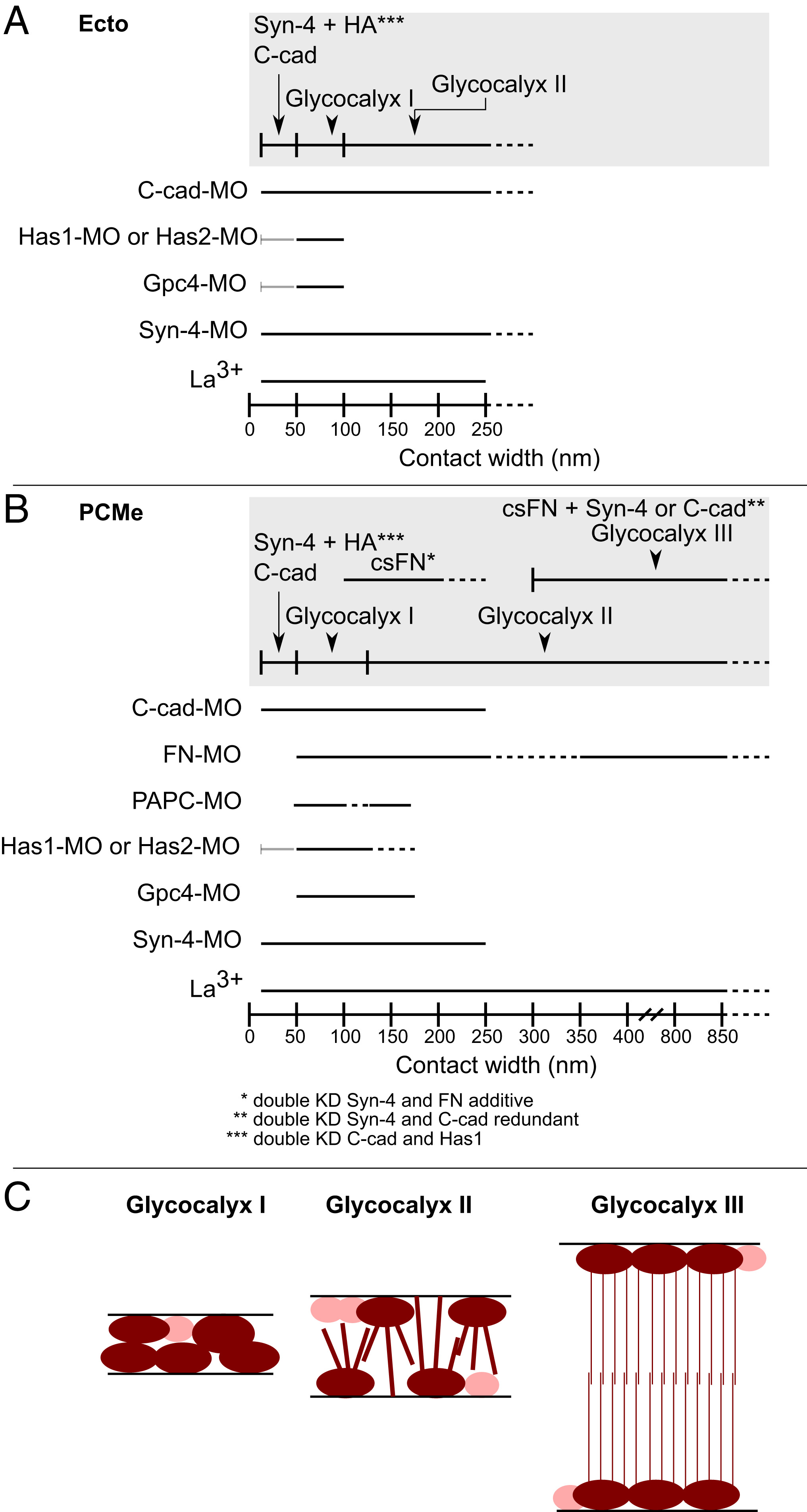 Fig. 10. Model of glycocalyx-mediated contacts in the Xenopus gastrula. Reconstruction of contact types in ectoderm (A) and prechordal mesoderm (B), based on difference spectra and La3+ staining. Solid and dashed lines indicate regions of width spectrum that are strongly or weakly reduced by single adhesion factor knockdown. Gray inhibitory arrows indicate supposed indirect inhibition of contacts. Gray box, reconstructed contact types; asterisks, results from double knockdown were used in deductions. (C) La3+ staining reveals different glycocalyx structures in the Xenopus gastrula. Only La3+-binding components of surface coats are visualized (dark red); others like FN or yet unidentified factors (pink) must be assumed to contribute. |