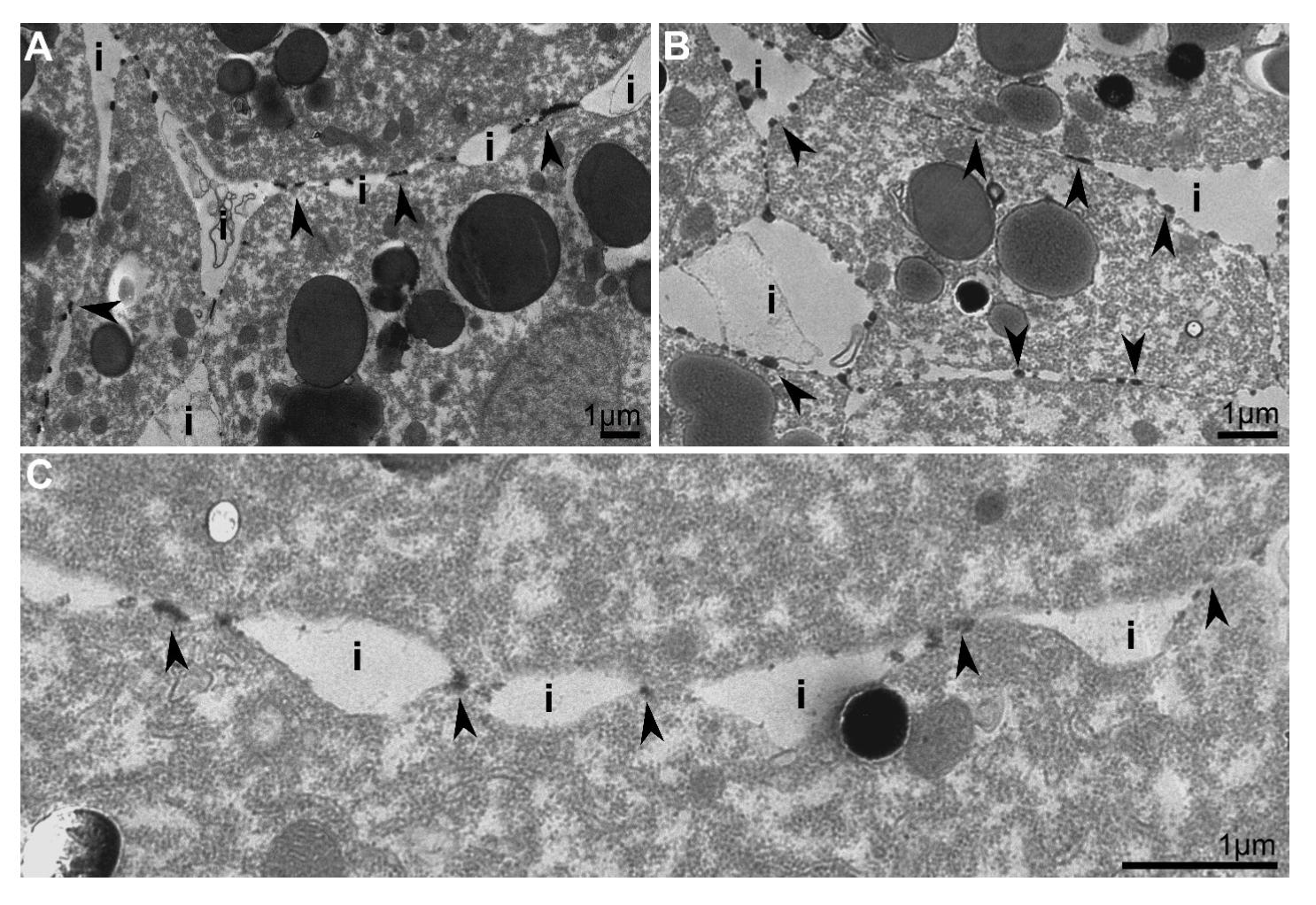 Supplementary figure 10. La3+ stains contacts and gaps in embryos placed in Ca2+ -free medium. (A, B) Remnants of dense glycocalyx plaques (black arrowheads) occur in contacts of varying widths and in gaps (i). (C) Stitch contacts with attachment points between two cells located at remnants of dense glycocalyx plaques. |