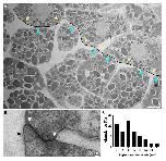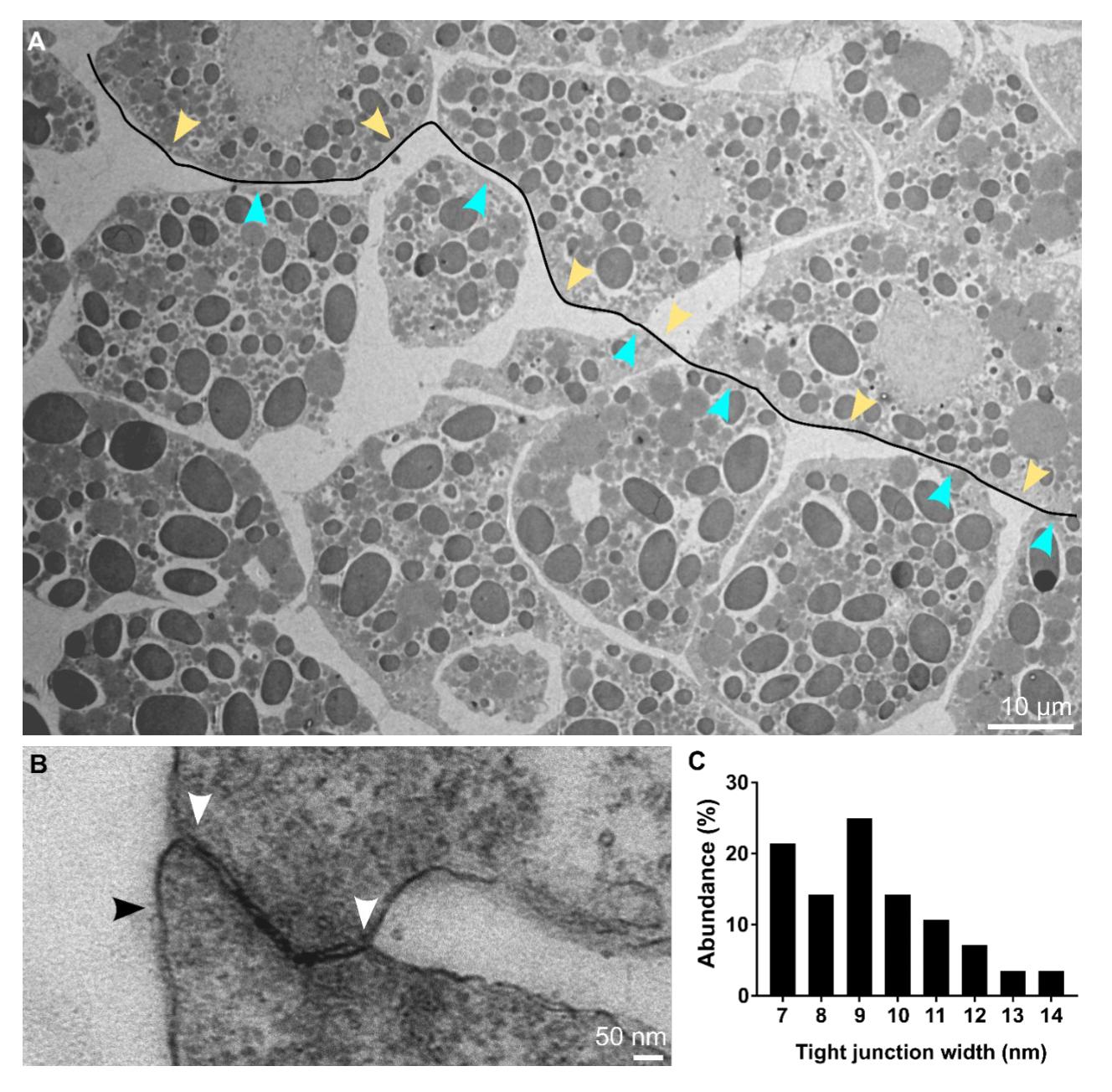Supplementary figure 11. Measurement of contacts and gaps. (A) TEM image of a region of the prechordal mesoderm. Contact widths were measured along non-overlapping lines between cells like the one shown, and the lengths of contact categories (cyan arrowheads) and gaps (yellow arrowheads) along the lengths of these lines were determined. (B) TEM image of a tight junction in the epithelial layer of a wildtype Xenopus gastrula. Black arrowhead indicates the apical surface of the cell, white arrowheads the ends of a tight junction. (C) Tight junction width distribution in the wildtype gastrula. n = 22 tight junctions. |