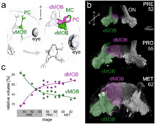 Fig. 1 Differential development of ORN projection areas in the ventral and dorsal MOB during metamorphosis. (a) The scheme shows axonal projections of ORNs residing in the PC innervating the vMOB (green) in the tadpole. After metamorphosis, the newly formed MC connects to the vMOB (green), while the remodeled PC epithelium innervates the dMOB (magenta). (b) 3D projections of the caudal part of the ONs and the ORN axonal projections during premetamorphosis (stages up to 54), prometamorphosis (55â58), and metamorphosis proper (59â65), stained with fluorophore-coupled WGA. Numbers in the panels indicate the developmental stages of the depicted animals. The projections to the vMOB are already present in premetamorphosis and retain their morphology during development (green). The dMOB projections start to form around stage 50 and increase dramatically in size until the end of metamorphosis (magenta). In contrast to the vMOB, the dMOB is not divided at the interhemispheric midline in later staged animals. (c) Volume share of axonal projections in the vMOB (green) and dMOB (magenta) relative to the total axonal projections during metamorphic development. Around stage 50, the dMOB only occupies less than 20% of the total axonal projection volume and grows to occupy more than 60% around stage 62. A anterior, D dorsal, dMOB dorsal main olfactory bulb, MC middle cavity, MET metamorphosis proper, ON olfactory nerve, P posterior, PC principal cavity, PRE premetamorphosis, PRO prometamorphosis, V ventral, vMOB ventral main olfactory bulb |