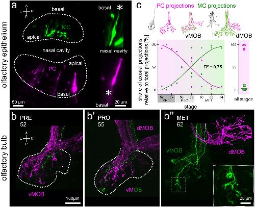 Fig. 2 MC axonal projections gradually replace PC fibers in the vMOB during metamorphosis. New PC neurons innervate the dMOB. (a) Labeling of ORNs in the olfactory epithelia of MC (green) and PC (magenta) using different fluorophore-coupled dextrans via sparse cell electroporation. Dotted lines indicate the boundaries of the sensory epithelia. Close-ups show single bipolar ORNs extending their dendrite into the nasal cavity. Asterisks highlight the axons. (bâbââ) Tracings of axonal projections in the vMOB of tadpoles during different developmental stages (indicated by numbers in the panels). During premetamorphosis (b), the first ORN axons originating in the newly forming MC reach the glomerular layer (green). In prometamorphic animals (bâ), both MC (green) and PC (magenta) axons are innervating glomeruli in the vMOB. During metamorphosis proper (bââ), the vMOB is solely innervated by axons originating in the MC (green), the newly formed dMOB only from PC fibers (magenta). Dotted lines indicate the outline of glomerular projections in the vMOB. The close-up shows axonal terminals of MC fibers in the glomeruli of the vMOB. (c) Scheme of innervation shift in the vMOB and newly formed connections to the dMOB (top). During premetamorphosis, the majority of vMOB projections originate in the PC (magenta), while at the end of metamorphosis, almost all axonal projections to the vMOB originate in the MC (green). The plot on the right shows the same data for the dMOB, which is only innervated by PC axons throughout development. A anterior, dMOB dorsal main olfactory bulb, L lateral, M medial, MC middle cavity, MET metamorphosis proper, ON olfactory nerve, P posterior, PC principal cavity, PRE premetamorphosis, PRO prometamorphosis, vMOB ventral main olfactory bulb |