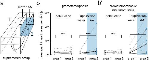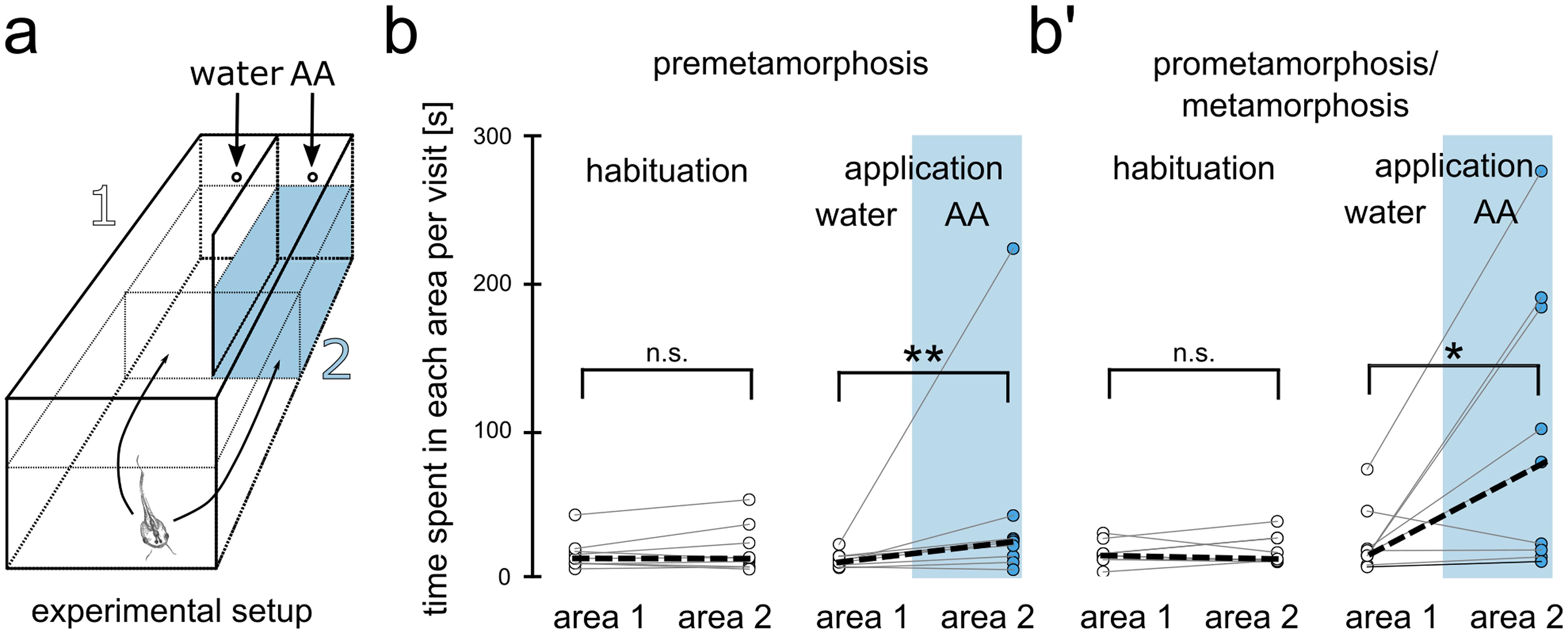 Fig. 4 Behavioral responses to amino acids are stable until metamorphic climax. (a) Experimental setup is shown. Tadpoles could freely move between area 1 and 2, which are separated by a dividing wall. After two hours of habituation, a water control stimulus was applied in area 1 and amino acids in area 2. (bâbâ) The average time each animal spent per visit to area 1 and area 2 during the habituation period (left) and after stimulus application (right) is shown for premetamorphic animals (b, nâ=â9) and pro-/metamorphic animals (bâ, nâ=â9). During the habituation period, no preference for either of the two areas was found. After stimulus application, both premetamorphic animals, as well as animals of higher stages were found to spend significantly more time per visit in the amino acid area. *pâ<â0.05, **pâ<â0.01. AA amino acids, PRE premetamorphosis, PRO prometamorphosis, MET metamorphosis proper |