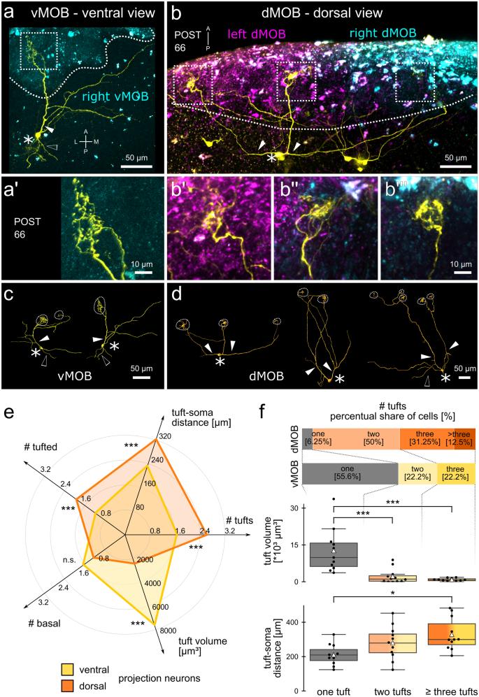 Fig. 6 Different morphology of projection neurons in the vMOB and dMOB of postmetamorphic Xenopus. ORN axonal projections from the olfactory epithelia (both PC and MC) were traced via electroporation of fluorophore-coupled dextrans (left: Cascade Blue dextran, magenta; right: Alexa Fluor 594 dextran, cyan), and projection neurons (yellow) with Alexa Fluor 488 dextran via sparse cell electroporation in the vMOB (a) and dMOB (b). White dotted lines indicate the ORN projections, tufts (white dotted squares in a, b) are shown in a higher magnification in (aâ) (vMOB), (bââbâââ) (dMOB). Reconstructions of representative neurons in the vMOB (c) and dMOB (d) are shown. Asterisks indicate the projection neuron somata, filled white arrowheads primary tufted dendritic branches and empty arrowheads primary basal neurites without tufted terminals. (e) Each radial axis on the radar chart represents a morphological descriptor of the projection neurons. The means of the descriptors of projection neurons in the vMOB (yellow; nâ=â18) and the dMOB (orange; nâ=â16) are shown. Dorsal projection neurons have a higher number of tufts, a longer average distance between soma and tufts and more primary tufted dendrites. Neurons in the vMOB have a significantly higher tuft volume. The number of primary basal neurites is similar between the groups. (f) The stacked barplots depict the percent share of uni-tufted (grey) and multi-tufted projection neurons (yellow, vMOB; orange, dMOB). A higher number of uni-tufted projection neurons was found in the vMOB (>â50%), whileâ>â90% of neurons in the dMOB terminated in at least two tufts, maximally in five tufts. Boxplots: Average tuft volumes (above) and average distance between tufts and somata (below) are compared between uni-tufted neurons (grey, left, nâ=â11), bi-tufted neurons (yellow/orange, middle, nâ=â12) and neurons with three or more tufts (dark yellow/dark orange, right, nâ=â11). White triangles depict the means. Tuft volume decreases with a higher number of tufts, while tuft-soma distance increases. The groups contain neurons from both the vMOB and the dMOB. *pâ<â0.05, **pâ<â0.01, ***pâ<â0.005. A anterior, dMOB dorsal main olfactory bulb, L lateral, M medial, ON olfactory nerve, P posterior, POST postmetamorphosis, vMOB ventral main olfactory bulb, PRE premetamorphosis, PRO prometamorphosis, MET metamorphosis proper, vMOB ventral main olfactory bulb |