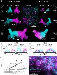 Fig. 3 Segregated odorant processing streams in the vMOB remain stable during metamorphic remodeling. (a) Maximum intensity projections of difference maps showing the increase in fluorescence signal after application of the odorant mixture (including amino acids, amines and bile acids; blue) and forskolin (yellow). The ventral (left) and dorsal (middle) halves of the vMOB of a prometamorphic (stage 57, above) and a metamorphic animal (stage 59, below) are shown. The two images to the right show the merged ventral and dorsal halves of the depicted vMOBs. White solid and dotted lines indicate the outline of ORN axonal projections of the ventral and dorsal halves, respectively. Segregation into a ventro-lateral forskolin-independent odorant processing stream and a medio-dorsal forskolin-dependent stream is visible. (aââaââââ) Positions of responsive regions along the anteriorâposterior and lateral-medial axes were measured and the probability density along those axes was estimated. Regions responding to odorants but not to forskolin (fsk-) are shown in blue, regions responding either to odorants and forskolin or only forskolin in orange (fskâ+). The 2D positional data of responsive regions of 11 vMOB hemispheres (nPROâ=â6, nMETâ=â5) from 8 different animals (nPROâ=â4, nMETâ=â4) was compared. First, between the ventral halves (aâ) and dorsal halves (aââ) of the vMOB as well as between prometamorphic (aâââ) and metamorphic animals (aââââ). White and black crosses indicate the peaks of the density estimates for the fsk-/fskâ+âprocessing streams, respectively. Each contour-level corresponds to an iso-proportion of the density distributions (20% of the distribution for each level). The distributions in each plot were normalized to the number of responding regions. Margin plots show the positions of individual responsive regions and their estimated density distribution along the respective axis. The responding regions belonging to the two streams show different distributions in all four plots, with the odorant positive/forskolin negative group located laterally and posteriorly and forskolin-responsive regions located medially and anteriorly. (b) Changes of the fluorescence signal of responding regions upon odorant/forskolin stimulations over time in seconds are shown. Fluorescence changes of individual time traces are presented as percentages of the maximum fluorescence of this region (%). Black lines in the background are time traces of all individual responsive regions belonging to a specific tuning profile. Colored lines represent the average traces of each tuning profile. The six most frequent response profiles are shown. Regions are tuned to amino acids, amines, or bile acids individually or in different combinations and either responsive or non-responsive to forskolin. Stacked bar plots show the percent share of individual tuning profiles among all identified responsive regions (nâ=â270) in the ventral and dorsal half of the vMOB in prometamorphic and metamorphic animals (ventral: nProâ=â110, nMETâ=â73; dorsal: nPROâ=â31, nMETâ=â56). Blue shaded profiles are forskolin-non-responsive (nâ=â111), yellow/orange profiles are forskolin-responsive (nâ=â159). A anterior, AA amino acids, AM amines, BA bile acids, FSK forskolin, L lateral, M medial, MET metamorphosis proper, ON olfactory nerve, P posterior, PRO prometamorphosis, vMOB ventral main olfactory bulb |