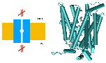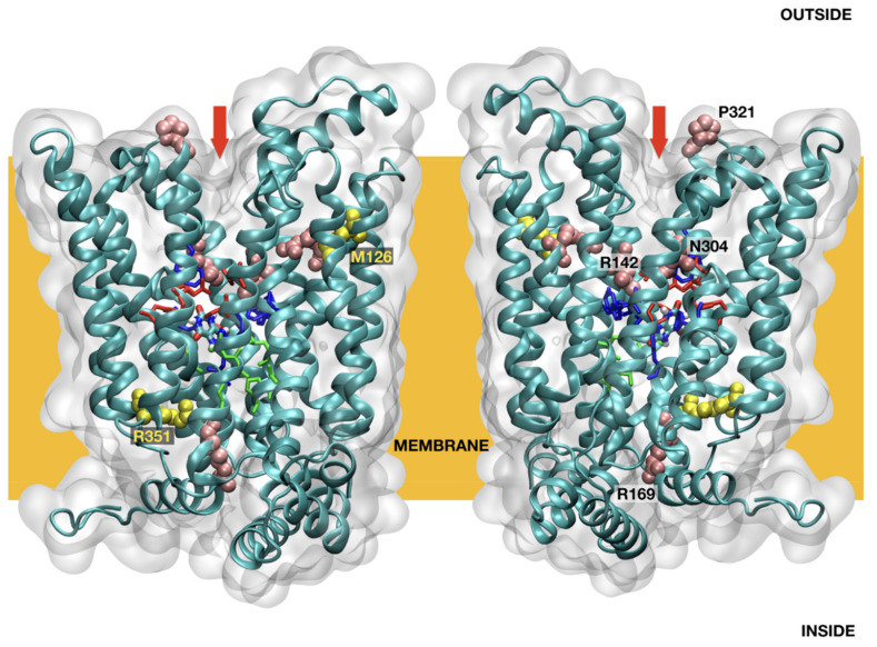 Figure 2. Mechanistic interpretation of the effects of the M126V mutation of SLC2A9b. The M126V model suggests that this mutation renders the vestibular regions unavailable. Left: schematic representation of the channel (in blue), membrane (yellow), and flow (arrows). Right: a snapshot of the M126V model during an MD trajectory, in cartoon representation in green. Internal space is represented by showing the solventâs accessible surface in gray.
