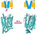 Figure 3. Effects of the R351W mutation of SLC2A9b. Top: schematic representation of the channel (in blue), membrane (yellow), and flow (arrows). Bottom: snapshots of the R351W model during an MD trajectory in cartoon representation in green. Internal space is represented by showing the solvent accessible surface in gray (compared to similar surfaces describing the vestibular areas in Figure 2). The initial model structure is surprisingly stable, but it deforms under molecular dynamics simulations, as seen in the snapshot on the right after ~30 ns of MD trajectory. Notice the very substantial reorganization of the internal helices.