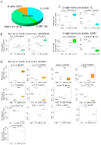 Figure 3. Gene expression is modulated by one, the other, or both hormones. Only genes displaying consistent expression between explants culture and whole animals were kept. (A) Types of gene regulation by T3 and CORT. (B) Gene regulation by either T3 or CORT. (C) Gene regulation by T3 and CORT. (D) Complex regulation by both hormones (X-talks). |